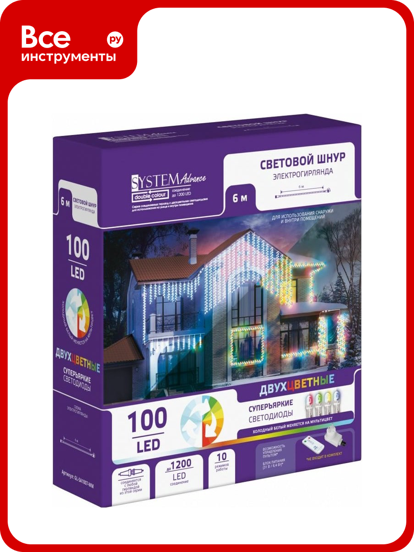 Электрогирлянда GLOS Световой шнур, 6 метров, 100 двухцветных светодиодов (холодный белый + мульти) GL-SA1007-WM: сравнение цен, характеристики, фото, актуальное наличие и цены.