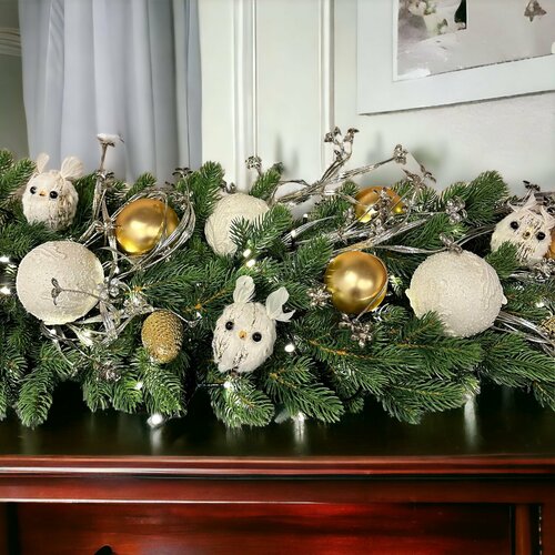 Гирлянда из искусственной хвои на проволочном каркасе. Длина 180 см. Изготовлена полностью из литых веточек. Количество веток в изделии – 288 штук.