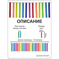 Гирлянда из ленточек 10 метров разноцветная - это уникальное украшение, которое станет незаменимым атрибутом любого праздника. Длина гирлянды составляет 10 метров, что позволяет использовать ее для украшения как больших помещений, так и маленьких уголков. Расстояние между лентами составляет всего 5 см, что делает гирлянду еще более плотной и яркой. Ленточки гирлянды изготовлены из полиэстера, что обеспечивает их долговечность и устойчивость к влаге. Даже если гирлянда намокнет под дождем, с ней ничего не случится. Гирлянда из ленточек 10 метров разноцветная предназначена для использования как внутри помещения, так и на улице. Она может стать отличным дополнением к фотосессии или стать ярким акцентом на празднике. В упаковке вы найдете 1 гирлянду длиной 10 метров из 100 разноцветных ленточек. Выбирая гирлянду из ленточек 10 метров разноцветную, вы получаете стильное и яркое украшение для любого праздника, которое будет радовать вас и ваших гостей.