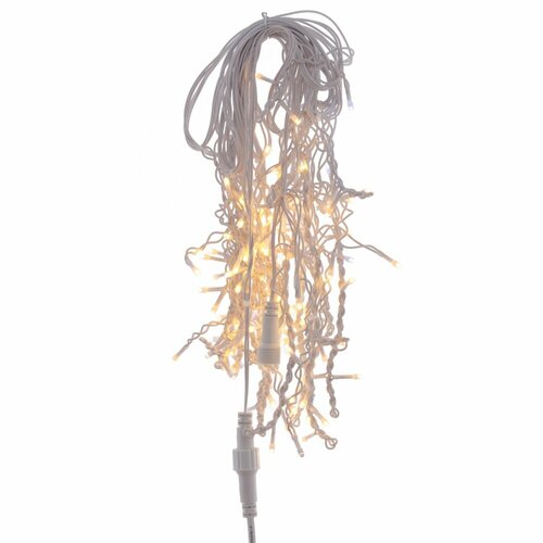 Электрогирлянда бахрома на белом шнуре, длина 20м. Состоит из 60 линий бахромы. Содержит 300 светодиодных ламп, расстояние между которыми 7см. Длина линий бахромы 45/61/45/28 см, расстояние между линиями 35 см. Имеет 1 тип свечения теплым белым светом с проблеском холодных белых огоньков. Такое свечение смотрится очень нарядно и не навязчиво. Мощность 9W, напряжение 220V. Степень защиты IP44 позволяет использовать гирлянду как в помещении, так и на улице. Адаптер L140 см и переходник в комплекте.
