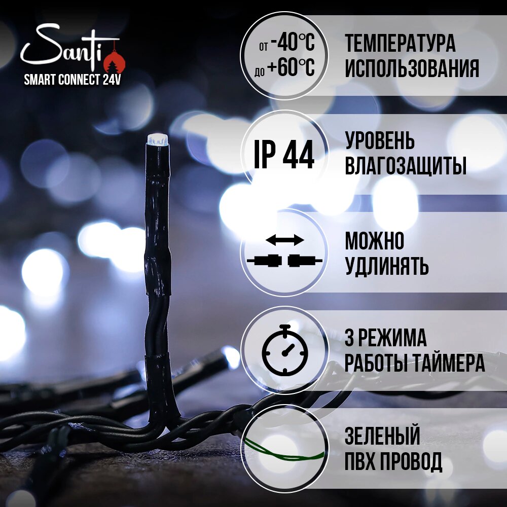 Купить Гирлянда Кластер 200LED 3 м холодный белый свет, зеленый провод IP44 ПВХ, 8 функций Smart connect STANDARD 24V Santi с доставкой по всей России. Гирлянда Кластер 200LED 3 м холодный белый свет, зеленый провод IP44 ПВХ, 8 функций Smart connect STANDARD 24V Santi: сравнение цен, характеристики, фото, актуальное наличие и цены.
