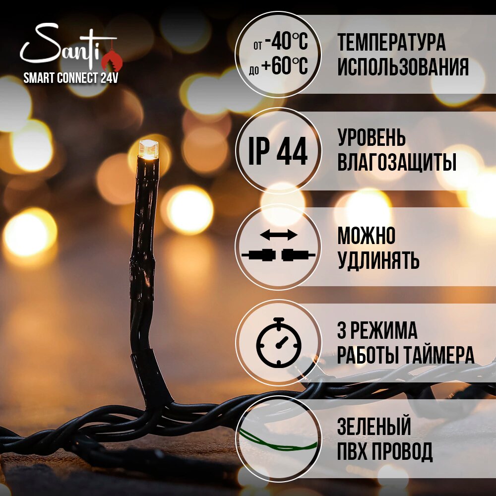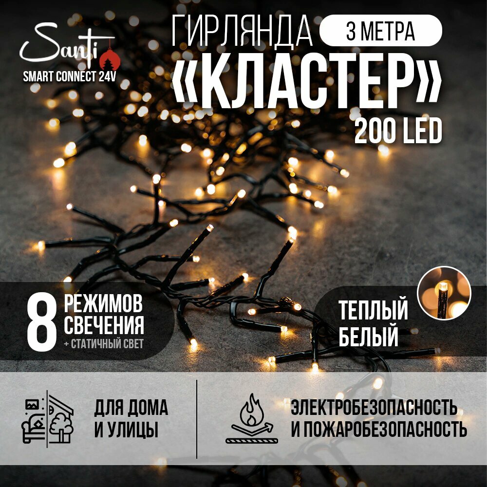 Купить Гирлянда Кластер 200LED 3 м теплый белый свет, зеленый провод IP44 ПВХ, 8 функций Smart connect STANDARD 24V Santi с доставкой по всей России. Гирлянда Кластер 200LED 3 м теплый белый свет, зеленый провод IP44 ПВХ, 8 функций Smart connect STANDARD 24V Santi: сравнение цен, характеристики, фото, актуальное наличие и цены.
