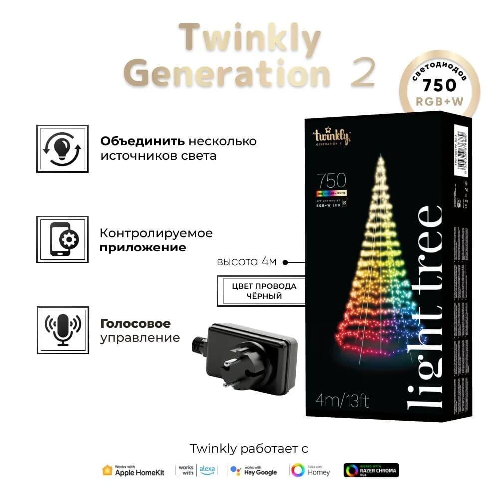 Светящаяся светодиодная елка 4M - Twinkly Light Tree - 750 шт. RGB+W + BT + Wi-Fi. Управление через приложение для смартфона. Ёлка с огнями - Огни, которые вам понравятся . Эти революционные светодиодные гирлянды привносят в наши дома уникальное световое оформление с использованием самых современных технологий. Светодиодное дерево — освещение управляется через мобильное приложение , совместимое как с Android, так и с iOS . Светодиодное дерево состоит из центрального столба высотой 4 метра и 750 светодиодов цветных RGB+W, протянутых сверху вниз, диаметр нижнего круга 2 метра, цвет кабеля черный.