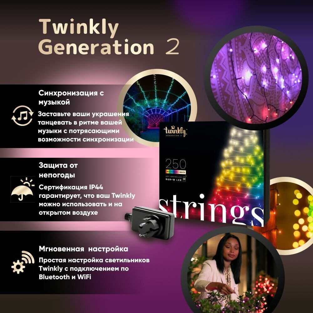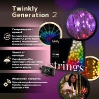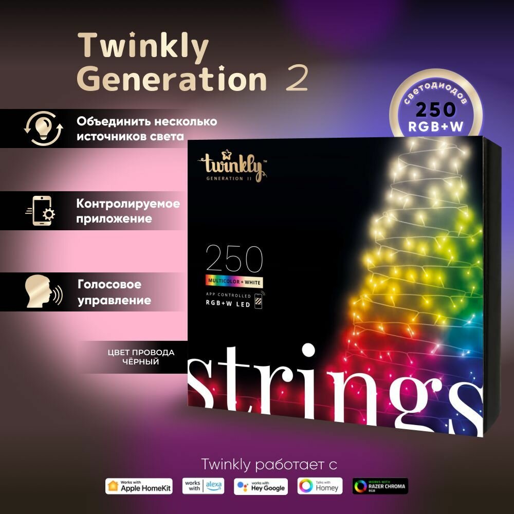 Рождественские гирлянды Twinkly Strings состоят из 250 светодиодных гирлянд, подходящих для украшения рождественской елки. Через каждые 8 см на кабелях расположен светодиод, который черно-зеленого цвета - чтобы гармонировал с деревом. RGB+W означает, что светодиодные светильники могут создавать световой оттенок RGB из 16 миллионов цветов + белый цвет W. Вы можете установить интенсивность освещения и точный цвет из цветовой шкалы. Это специальное издание включает интеграцию умного дома с Google Assistant и Amazon Alexa .