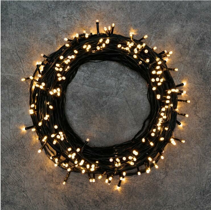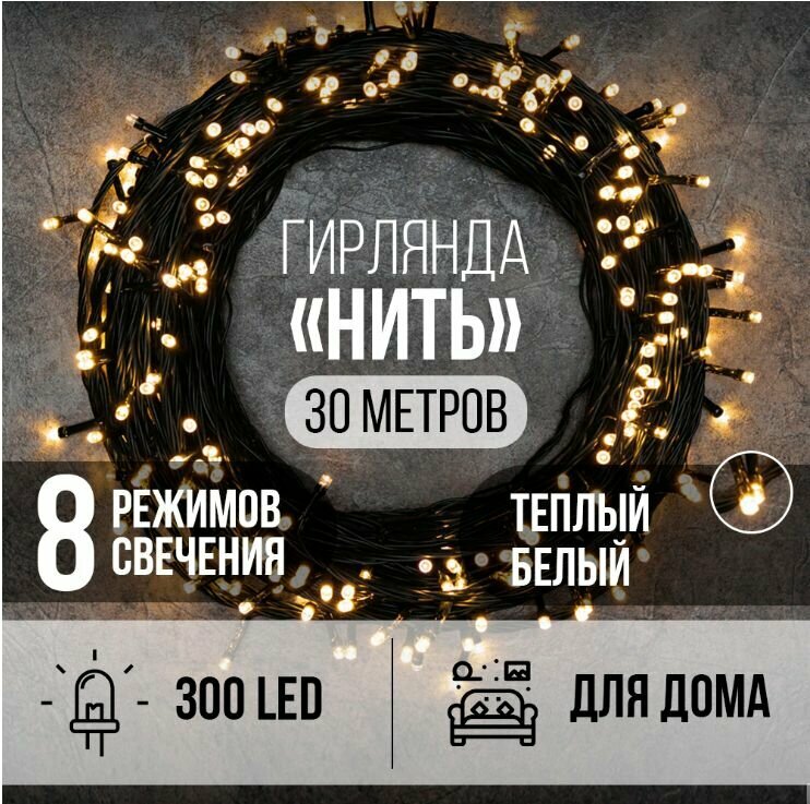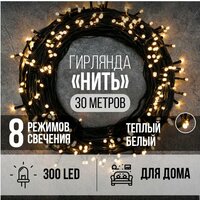 Купить Гирлянда Нить 300LED 30 м теплый белый свет, зеленый провод IP20 ПВХ, 8 функций с доставкой по всей России.