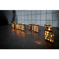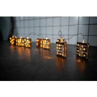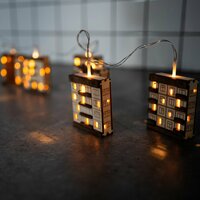 Светодиодная электрогирлянда на прозрачном проводе. Плафоны в виде панельных домов. Количество светодиодов 10 штук. Длина 1.5 метра. Данная гирлянда выполнена из дерева, что придает ей традиционность, теплоту и ламповость. Светится тёплым белым светом. Питание от трёх пальчиковых батареек АА (в комплект не входят). На кейсе для батареек есть кнопка отвечающая за включение/выключение гирлянды и режим мерцания. Гирлянда в виде панельных домов может создать атмосферу уюта у вас на кухне, в кафе или баре. Помимо этого, такая гирлянда подойдет для архитектурного бюро, кабинета архитектора, или просто человека, желающего поностальгировать по романтике советской архитектуры. Ну и в конце концов никто не отменял возможность традиционного декорирования новогодней елки)