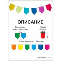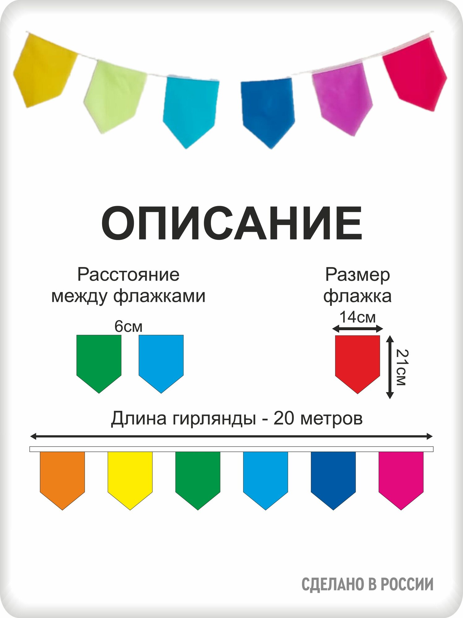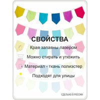 Гирлянда из флажков "Домик" длиной 20 метров и разноцветная, что позволяет использовать ее на различных мероприятиях и праздниках. Флажки гирлянды имеют размеры 14х21 см и расстояние между ними составляет 6 см. В гирлянде 100 флажков, вырезанных с помощью лазера, что гарантирует отсутствие осыпающихся краев. Флажки можно стирать и утюжить, что обеспечивает их долговечность и удобство использования. Гирлянда изготовлена из синтетической ткани (полиэстер), что делает ее устойчивой к влаге и дождю. Это позволяет использовать гирлянду на улице и в помещении, а также в случае намокания флажков, с ними ничего не случится. В упаковке находится одна гирлянда, что делает ее удобной для транспортировки и хранения. Гирлянда из флажков станет отличным украшением для помещения или улицы, а также для проведения фотосессий. Она подойдет для различных праздников и мероприятий, таких как выпускной в детском саду, школе, день рождения, гендер пати, День знаний, юбилей, свадьба, корпоратив, девичник и других.
