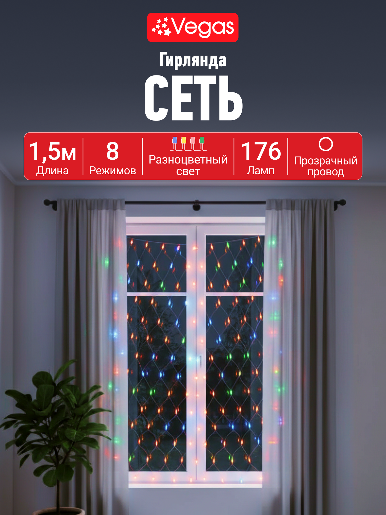 Купить Гирлянда «Сеть», 176 разноцветных LED ламп, контроллер 8 режимов, прозрачный провод, 1,5*1,5 м, 220 v, VEGAS с доставкой по всей России. Гирлянда «Сеть», 176 разноцветных LED ламп, контроллер 8 режимов, прозрачный провод, 1,5*1,5 м, 220 v, VEGAS: сравнение цен, характеристики, фото, актуальное наличие и цены.