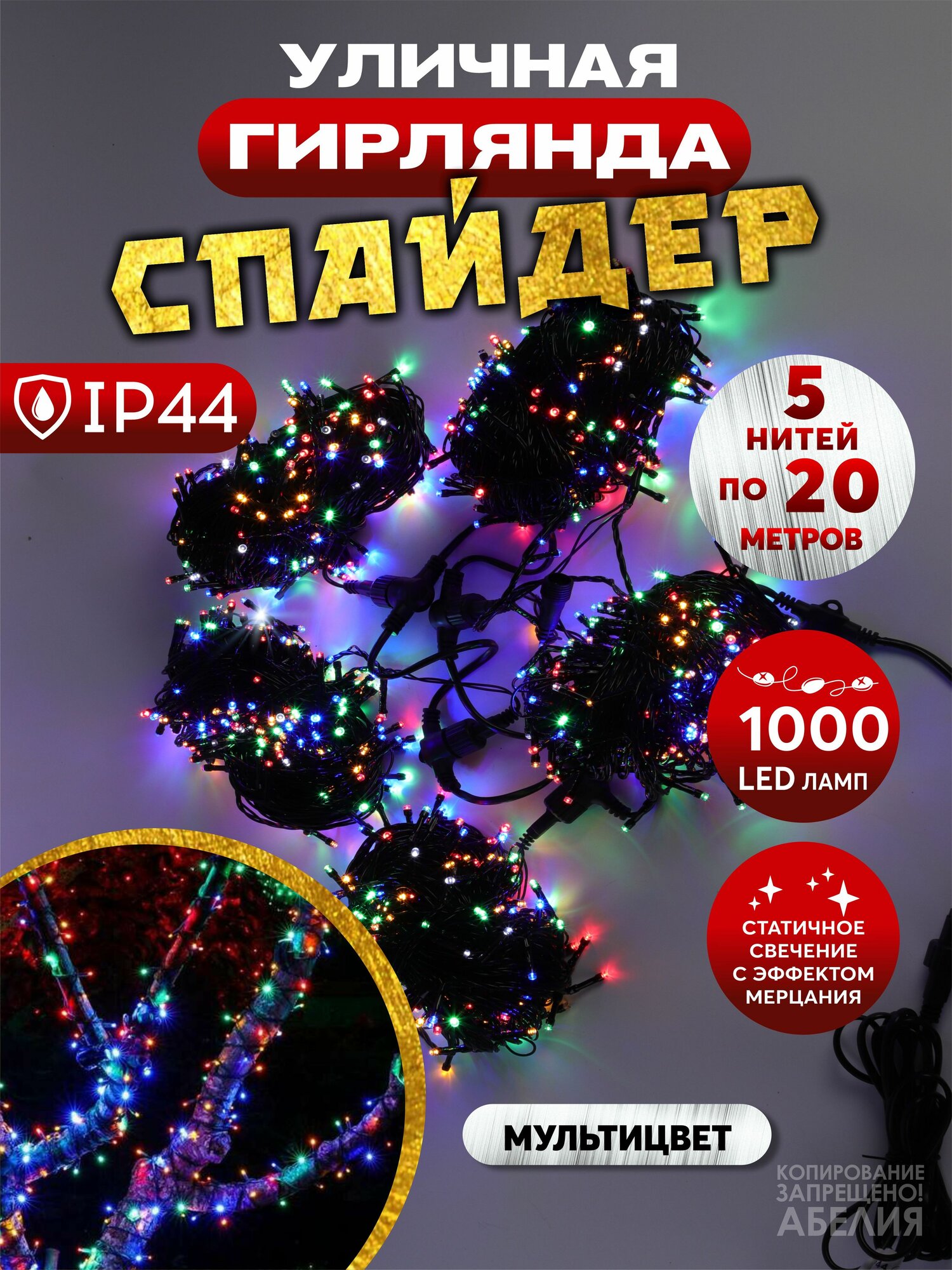 Гирлянда спайдер с эффектом мерцания — идеальное решение для создания праздничной атмосферы как внутри помещений, так и на улице. Эта электрогирлянда длиной 1000 LED освещает пространство размерами 5х20 метров и обеспечивает яркое и эффектное освещение. С водонепроницаемым покрытием класса IP44, она устойчива к влаге и идеально подходит для использования в любых погодных условиях.