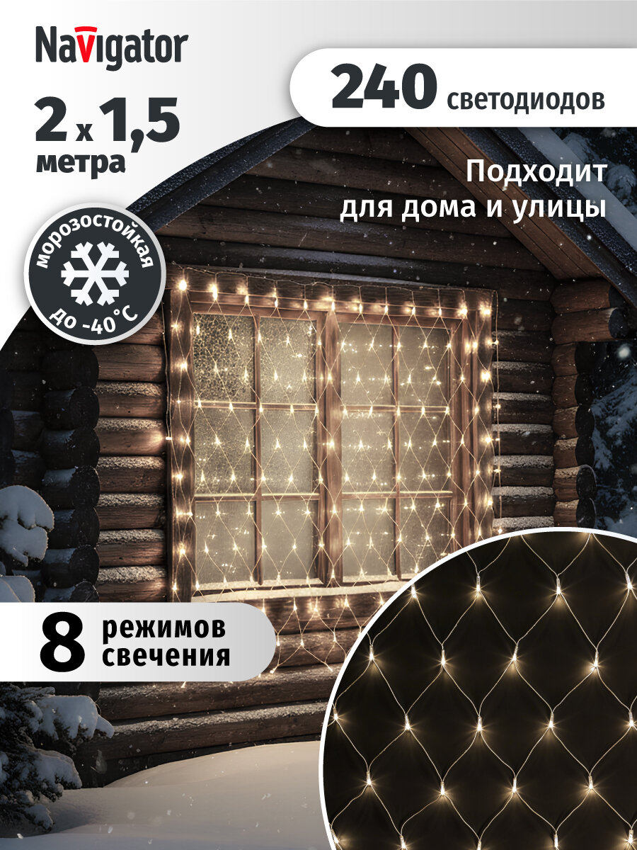 Гирлянда-сетка — это идеальный выбор для создания праздничной атмосферы в доме, на балконе, кухне, в детской или любой комнате. Новогодняя и декоративная гирлянда размером 2×1,5 м оснащена 240 светодиодами с теплым белым светом, обеспечивающими яркое и равномерное освещение. Благодаря 8 режимам свечения, вы сможете легко подобрать подходящий вариант для декора елки, окна, стены, фотозоны или даже для оформления уличной зоны — гирлянда морозостойкая до -40 градусов и имеет защиту от влаги IP44.