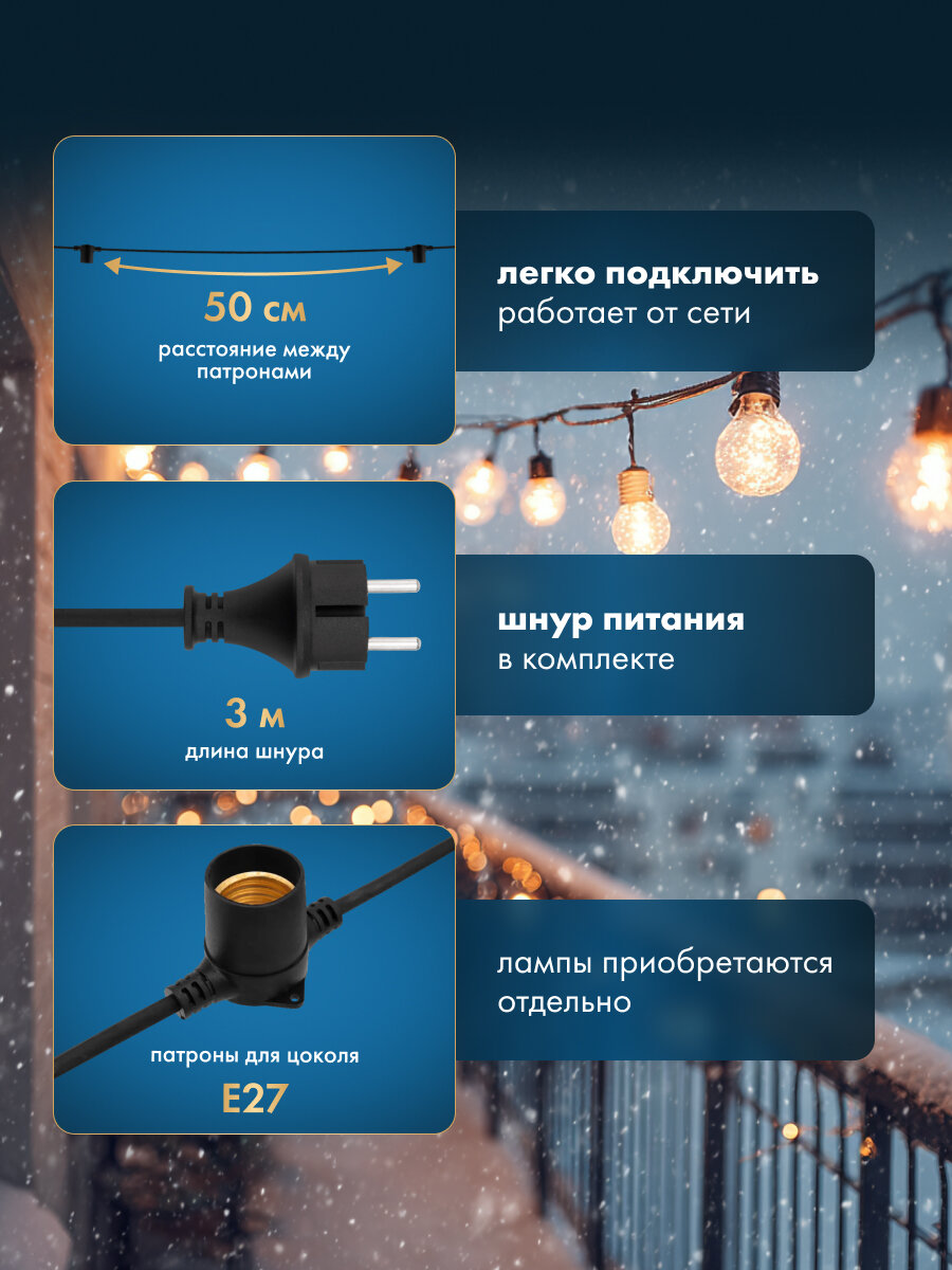 | Комплектация | Гирлянда – 1 шт., сетевой шнур питания длиной 1.5 метра – 1 шт., вилка – 1 шт., встроенные патроны – 40 LED., упаковка – 1 шт., инструкция – 1 шт. |