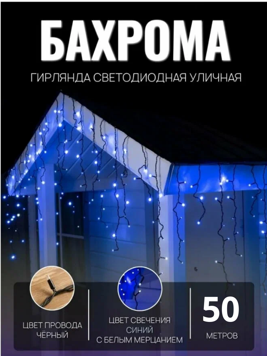 Гирлянда уличная бахрома 50м чёрный провод / Гирлянда светодиодная, синий свет