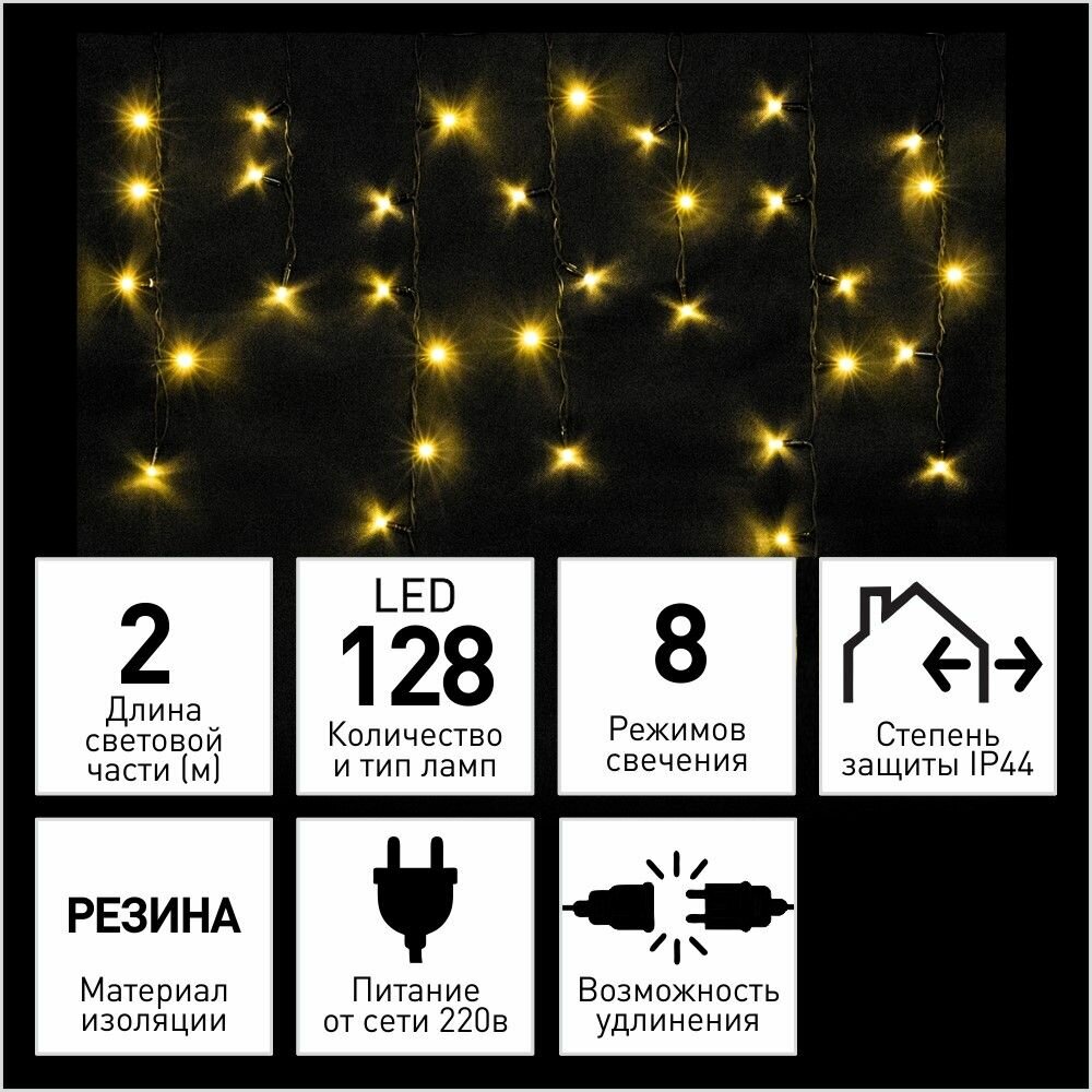 Купить Гирлянда универсальная Бахрома 128LED 2х1,4 м, теплый белый, IP44 резина, 8 функций с доставкой по всей России.