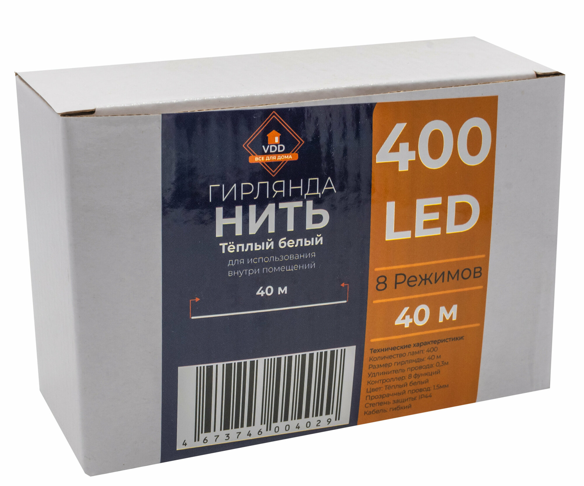 Купить Гирлянда VDD «Нить», 40 м, 400 светодиодов, IP44, теплый белый свет с доставкой по всей России. Гирлянда VDD «Нить», 40 м, 400 светодиодов, IP44, теплый белый свет: сравнение цен, характеристики, фото, актуальное наличие и цены.
