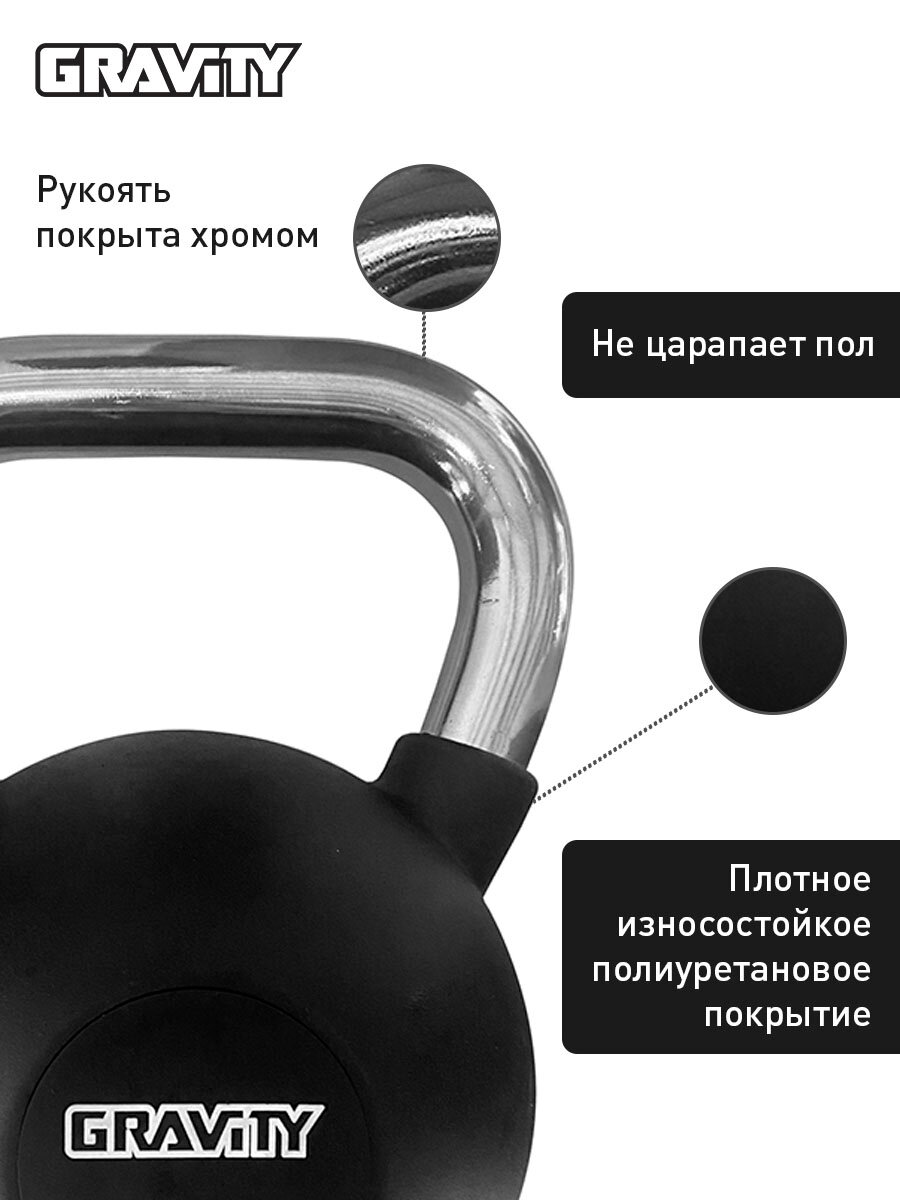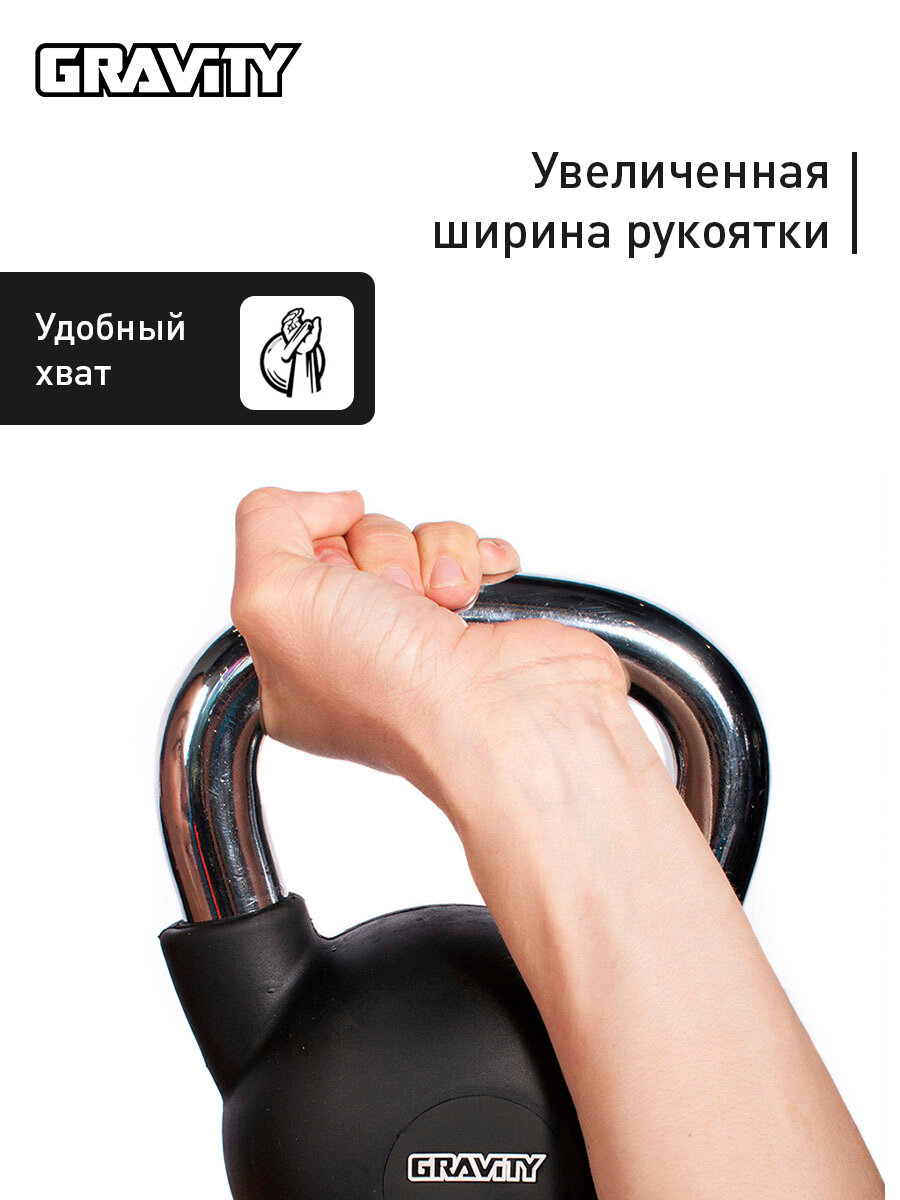 Увеличенная ширина рукоятки позволяет тренирующемуся комфортнее держать гирю обеими руками; Снаряд имеет плотное полиуретановое покрытие, что делает его более износостойким и сводит к минимуму вероятность повреждения при падении; Для удобства ориентации на каждую гирю нанесена информация о ее весе; Рукоять покрыта хромом, что обеспечивает долговечность покрытия и сохранение презентабельного вида снаряда даже спустя многие месяцы самого активного использования.