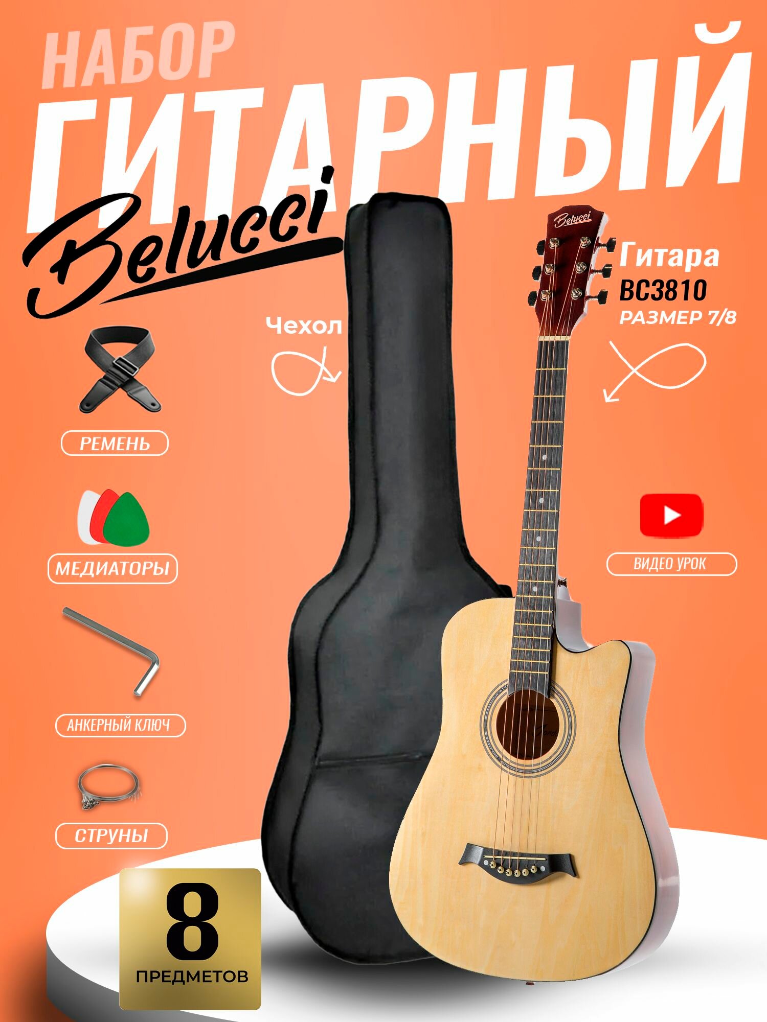 | В комплекте | — Гитара акустическая 38” — Чехол для гитары 38” — Анкерный ключ — Ремень для гитары — Струны для замены 6 шт. — Медиаторы 3 шт. — Фирменные видеоуроки для начинающих — Пособие по эксплуатации — Стикерпак для кастомизации |