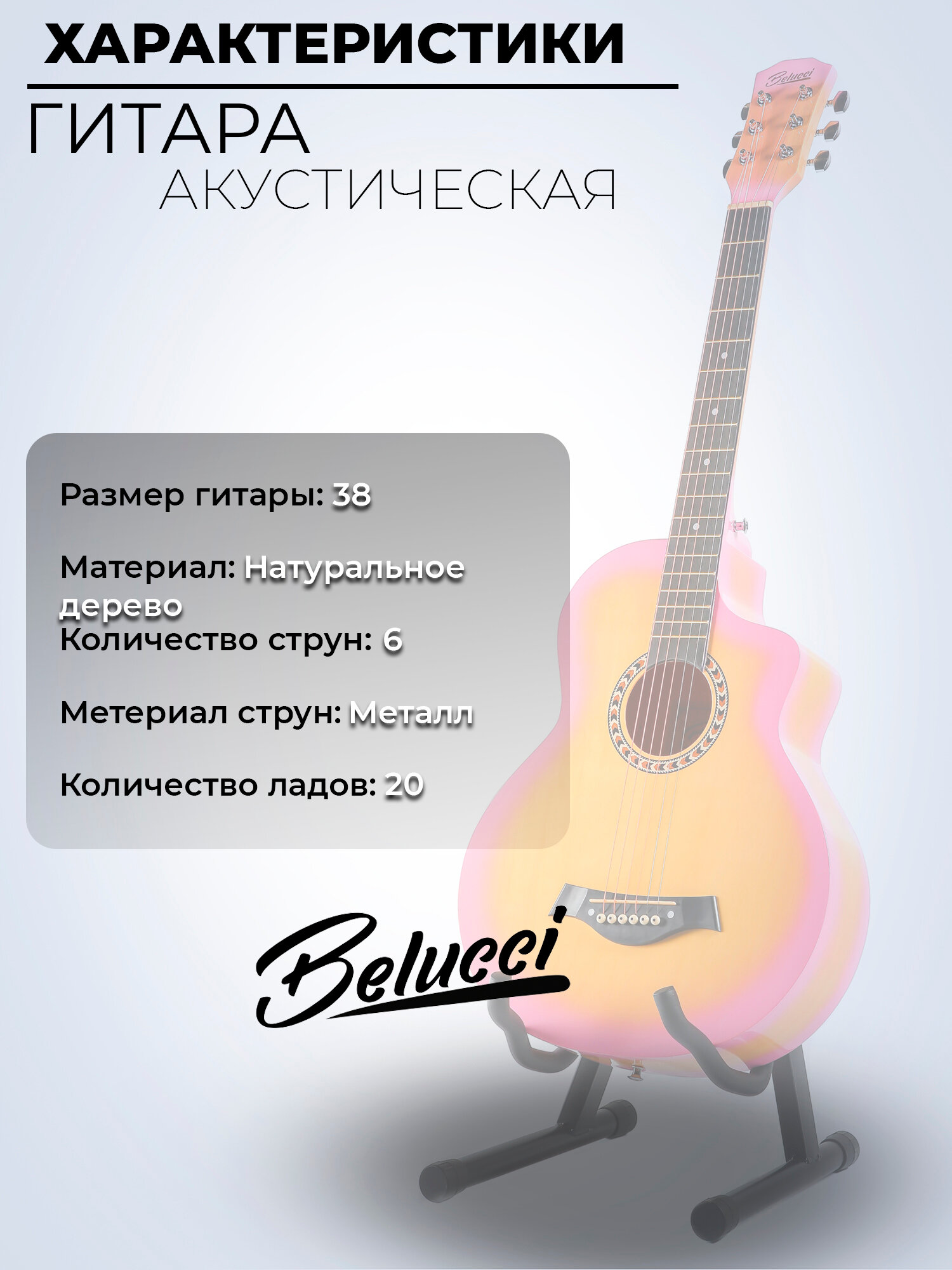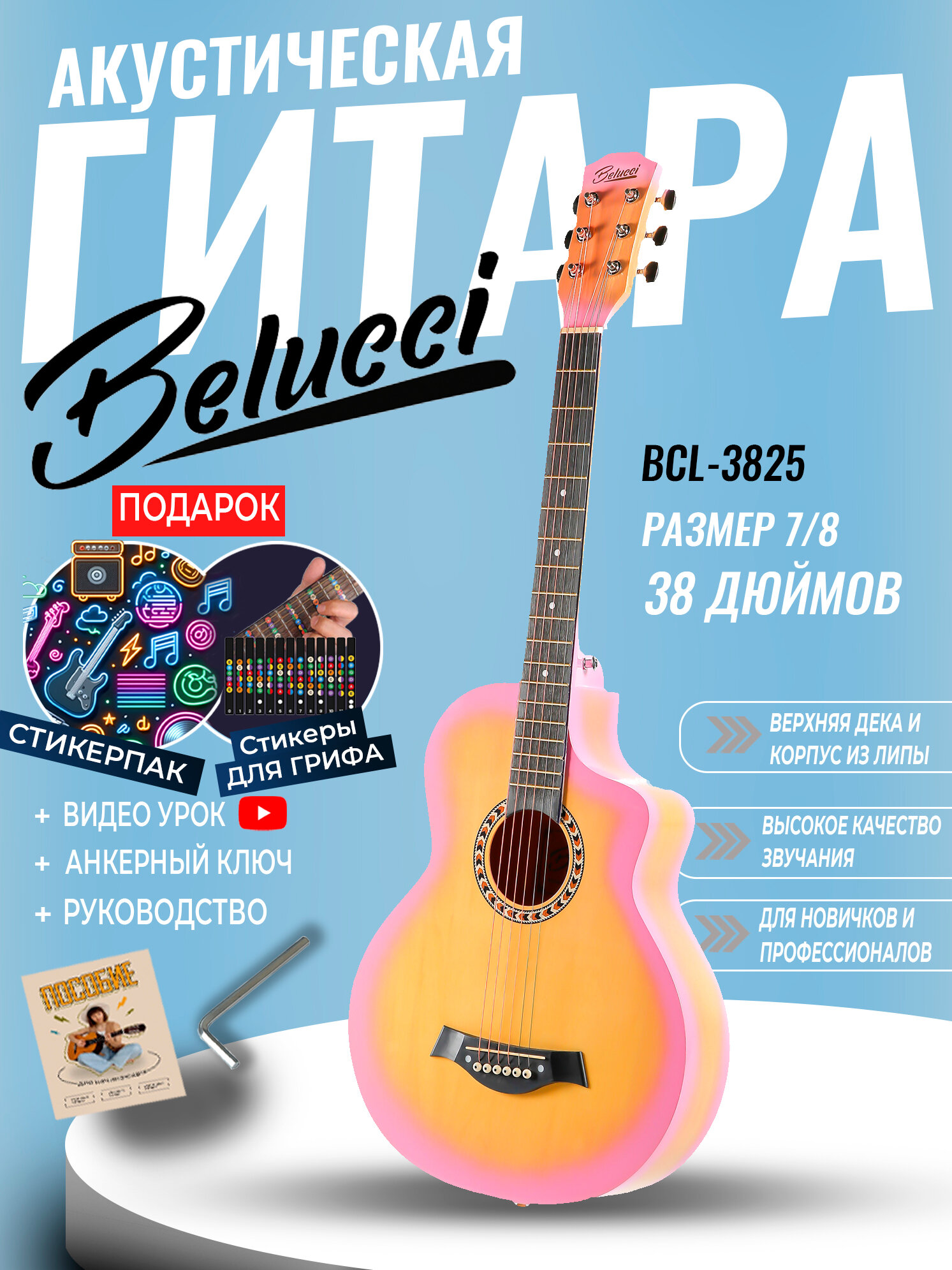 Гитара акустическая 38″ Светло-оранжевая (Инструмент начинающего музыканта, Belucci BCL3825 YG): сравнение цен, характеристики, фото, актуальное наличие и цены.