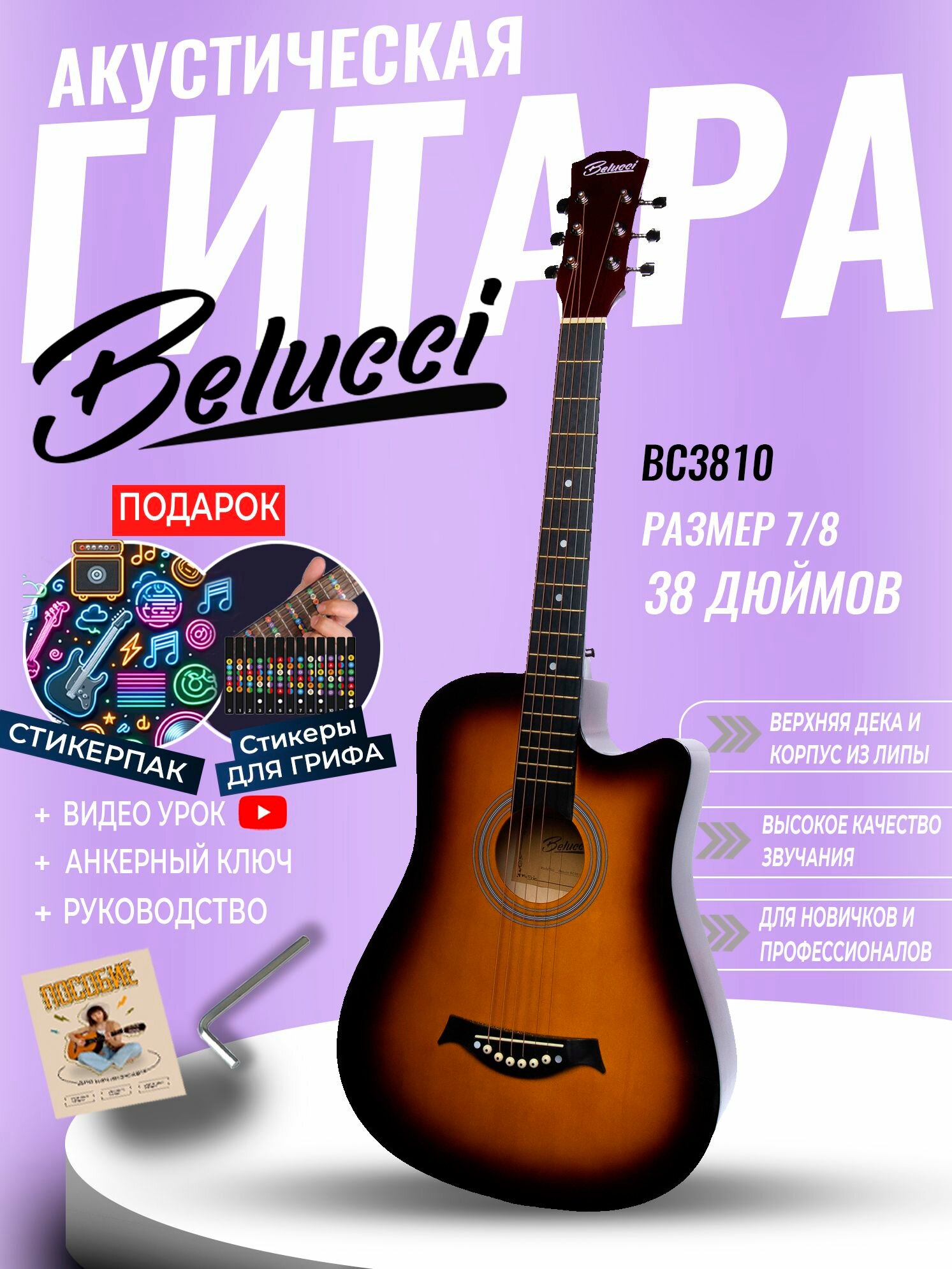 Акустическая гитара Belucci BC3810 38" – готовый набор для начинающих!