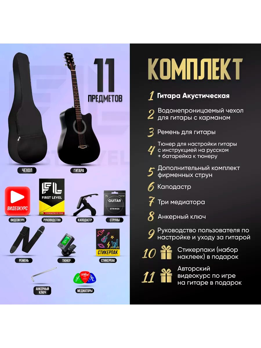 Акустическая гитара 38 дюймов с металлическими струнами, размер 7/8 - прекраный выбор для начинающих гитаристов, чтобы приобрести качественное звучание по доступной цене и научиться играть за самый короткий срок. Анкерный гриф позволит самостоятельно отрегулировать струны по высоте. Начальный уровень игры на инструменте легко освоить ребенку и взрослому именно с таким универсальный музыкальным инструментом. Технические характеристики гитары подойдут как мальчику, так и девочке, в подарок мужчине или женщине, а стильный дизайн поможет выделиться и проявить себя в любой компании. Начинающие и опытные гитаристы оценят все достоинства комфортного исполнения любимых жанров благодаря немного уменьшенному корпусу гитары. В подарок музыкантам мы предлагаем комплект аксессуаров PREMIUM: водонепроницаемый чехол для гитары с карманом, ремень для гитары, тюнер для настройки гитары, дополнительный комплект фирменных струн, каподастр, три медиатора, анкерный ключ, руководство пользователя по настройке и уходу за гитарой, стикерпак (набор наклеек) и авторский курс по игре на гитаре - данные аксессуары подчеркнут образ музыкального инструмента, помогут быстро освоить основы игры для начинающих или совершенствовать свои навыки для опытных музыкантов. Весь комплект поставляется в одной прочной коробке.