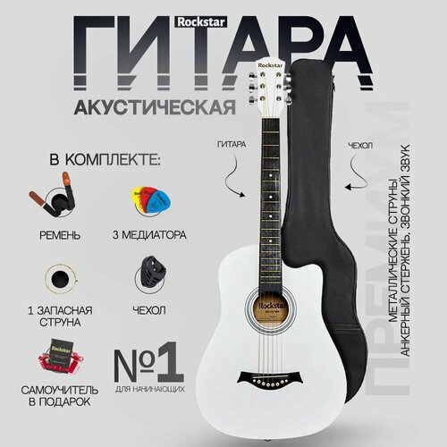 Rockstar входит: 1. Гитара акустическая 38 2. Водонепроницаемый Чехол с доп. карманом 3. Ремень для гитары 4. Комплект струн для акустической гитары 5. Каподастр металлический 6. держатель для гитары 7. Комплект с 3 медиаторов 8. Запасная первая струна 9. Тюнер 10. Руководство по настройке гитары