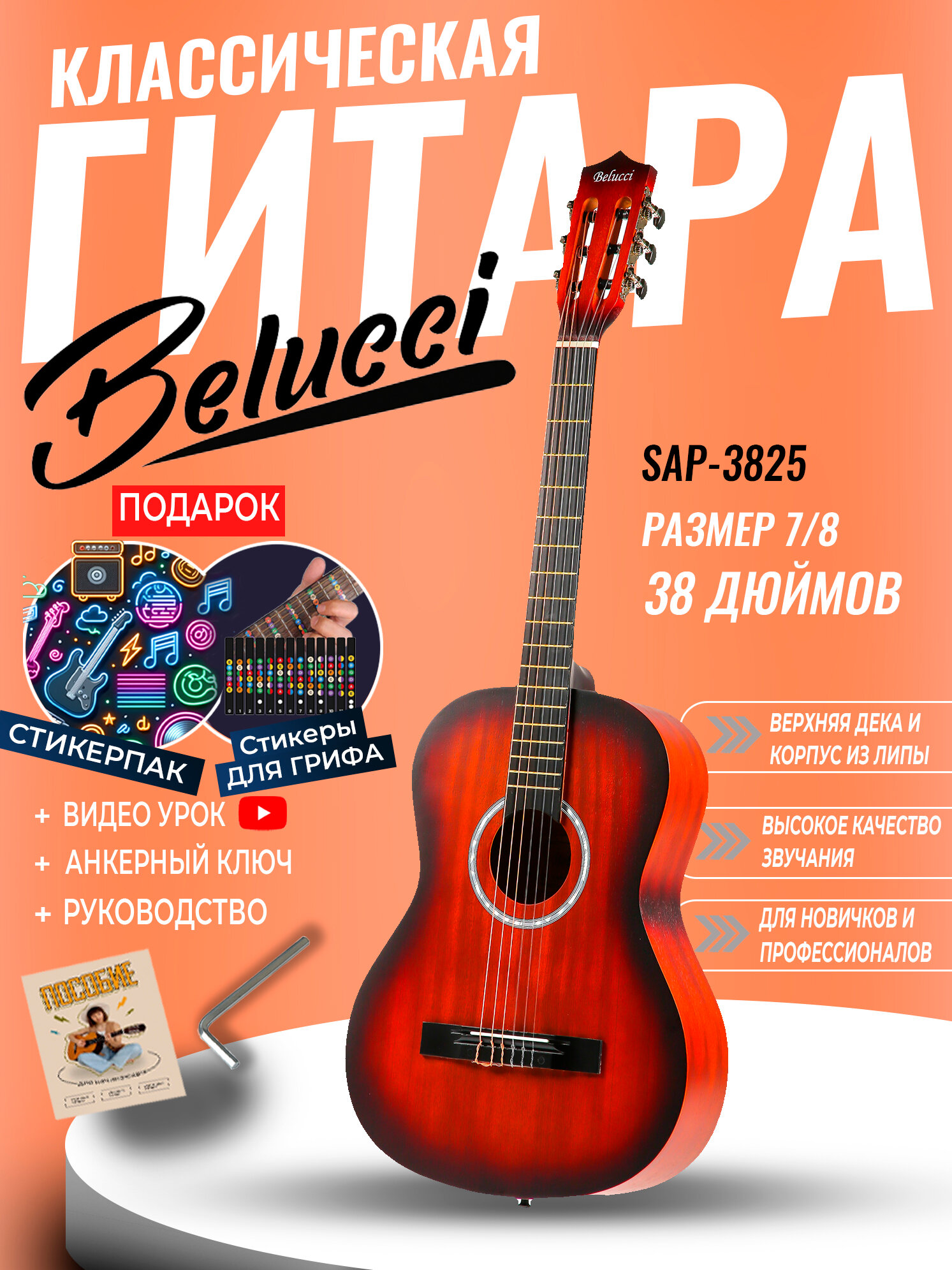Гитара классическая 38″ 7/8 Санбёрст (Инструмент начинающего музыканта, Belucci SAP3825 SB): сравнение цен, характеристики, фото, актуальное наличие и цены.