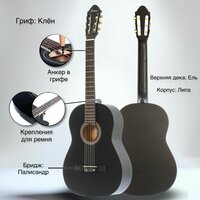Купить Гитара классическая 39″ 4/4 Чёрная (Инструмент начинающего музыканта, Fabio KM3915 BK) с доставкой по всей России.