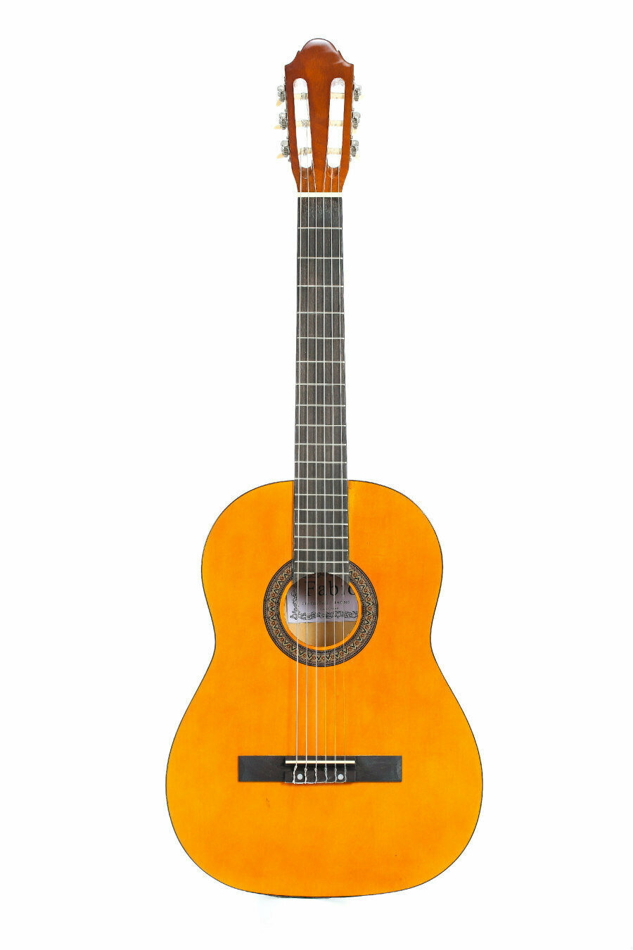 Fabio FAC-503 – доступная классическая гитара для начинающих гитаристов. Она выполнена в натуральном цвете, что придает ей красивый естественный вид, которым и знаменит данный тип гитар. У нее также привлекательная розетка в виде орнамента и никелированные колки, плюс вы будете приятно удивлены ее звучанием. Если вы думаете о том, чтобы попробовать свои силы в игре на гитаре, или просто любите время от времени играть на инструменте, вам определенно стоит рассмотреть эту классическую модель начального уровня. Эта полноразмерная гитара с нейлоновыми струнами качественно изготовлена из липы, которая помогает воспроизводить хорошо сбалансированный звук. Гриф удобен для начинающих и произведен из клена, покрытым накладкой из искусственного палисандра.