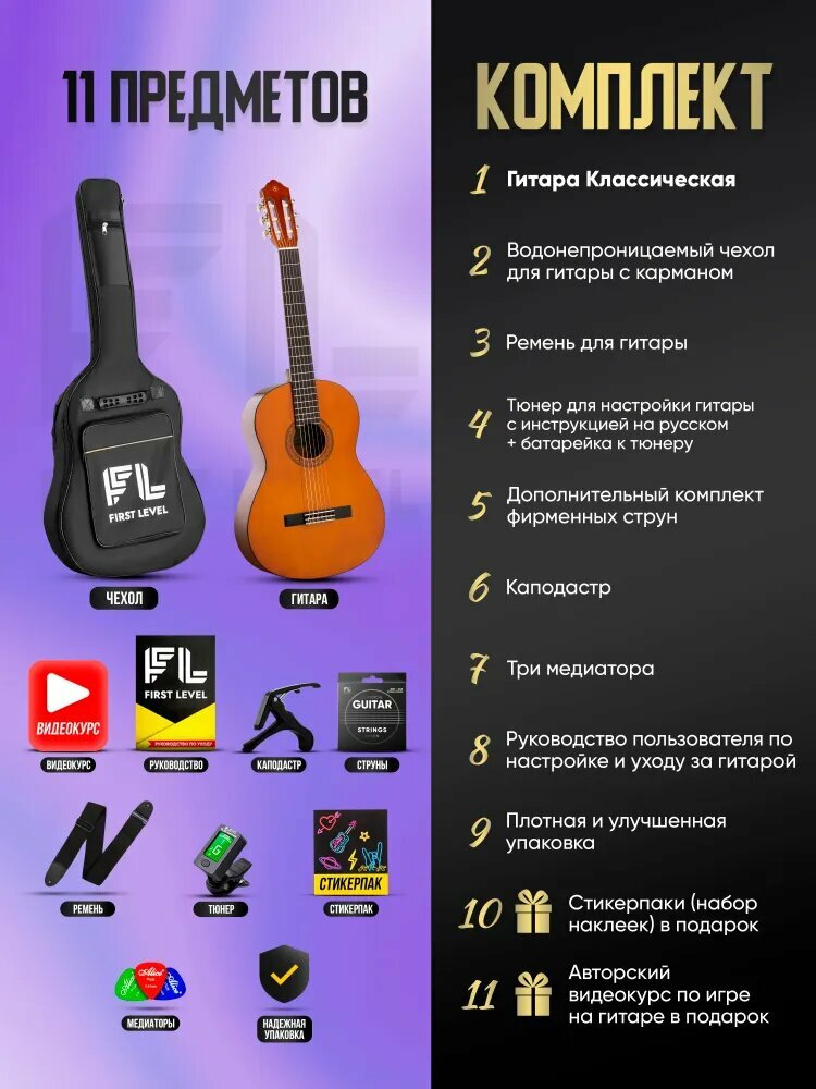 | В комплекте | Классическая гитара, запасной комплект гитарных струн, рюкзак, каподастр, медиаторы (случайные цвета), тюнер, ткань для протирки (случайные цвета). |