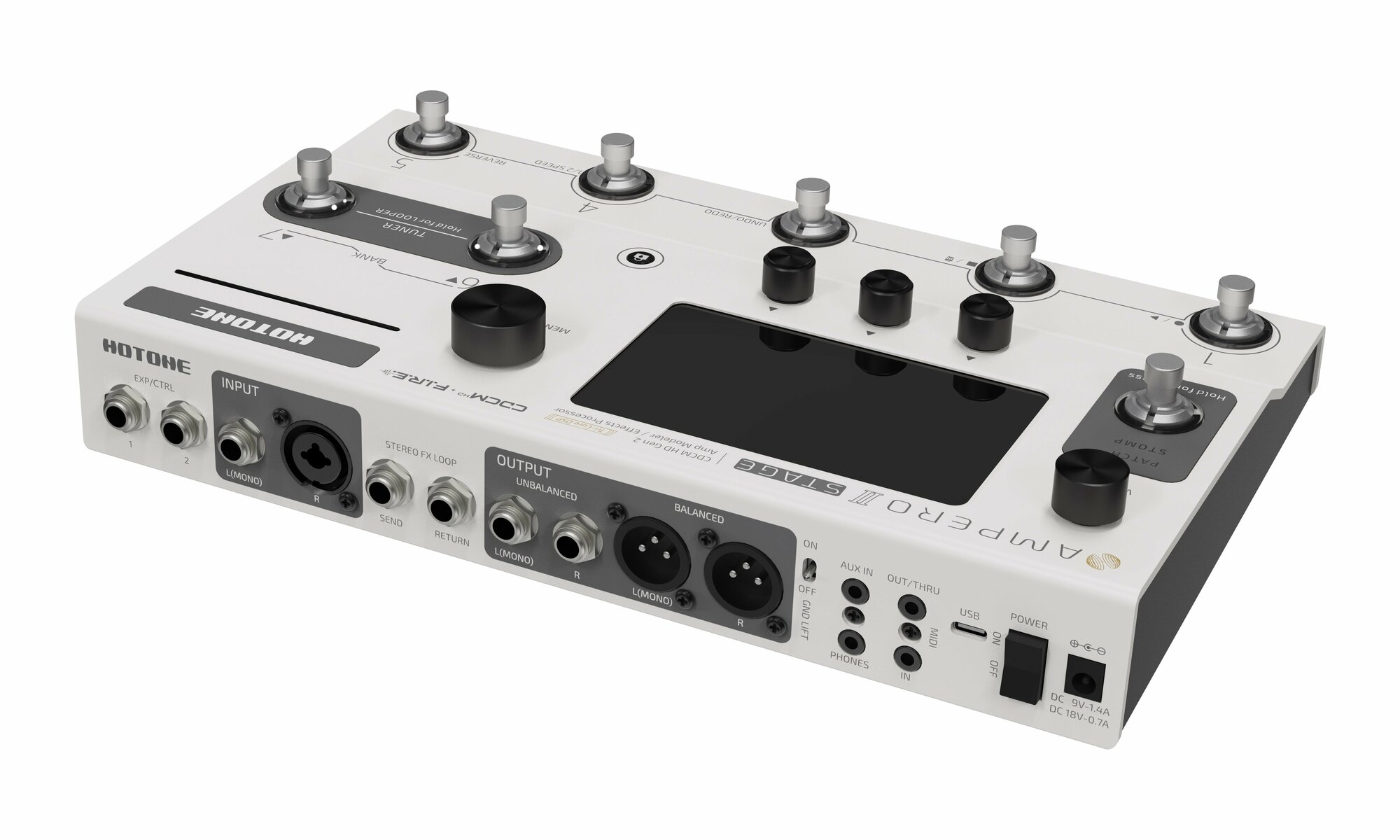 Основываясь на опыте линейки Hotone Ampero и отзывах пользователей, Ampero II Stage может похвастаться обновленным дизайном пользовательского интерфейса в сочетании с большим 5-дюймовым цветным сенсорным экраном. Процессор предлагает интуитивно понятное взаимодействие с пользователем, подобное смартфону, обеспечивая плавное управление и настройку.