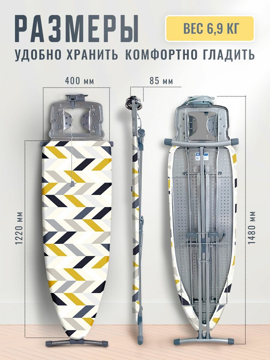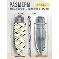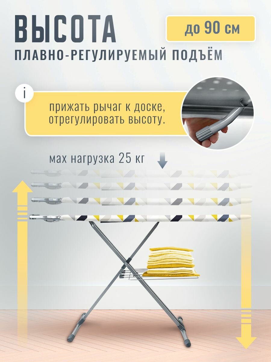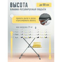 Доска оснащена плавной регулировкой по высоте, что позволяет выбрать оптимальное положение для удобства глажки. Максимальная нагрузка на гладильную поверхность составляет 25 кг, что говорит о высокой прочности и долговечности конструкции.
