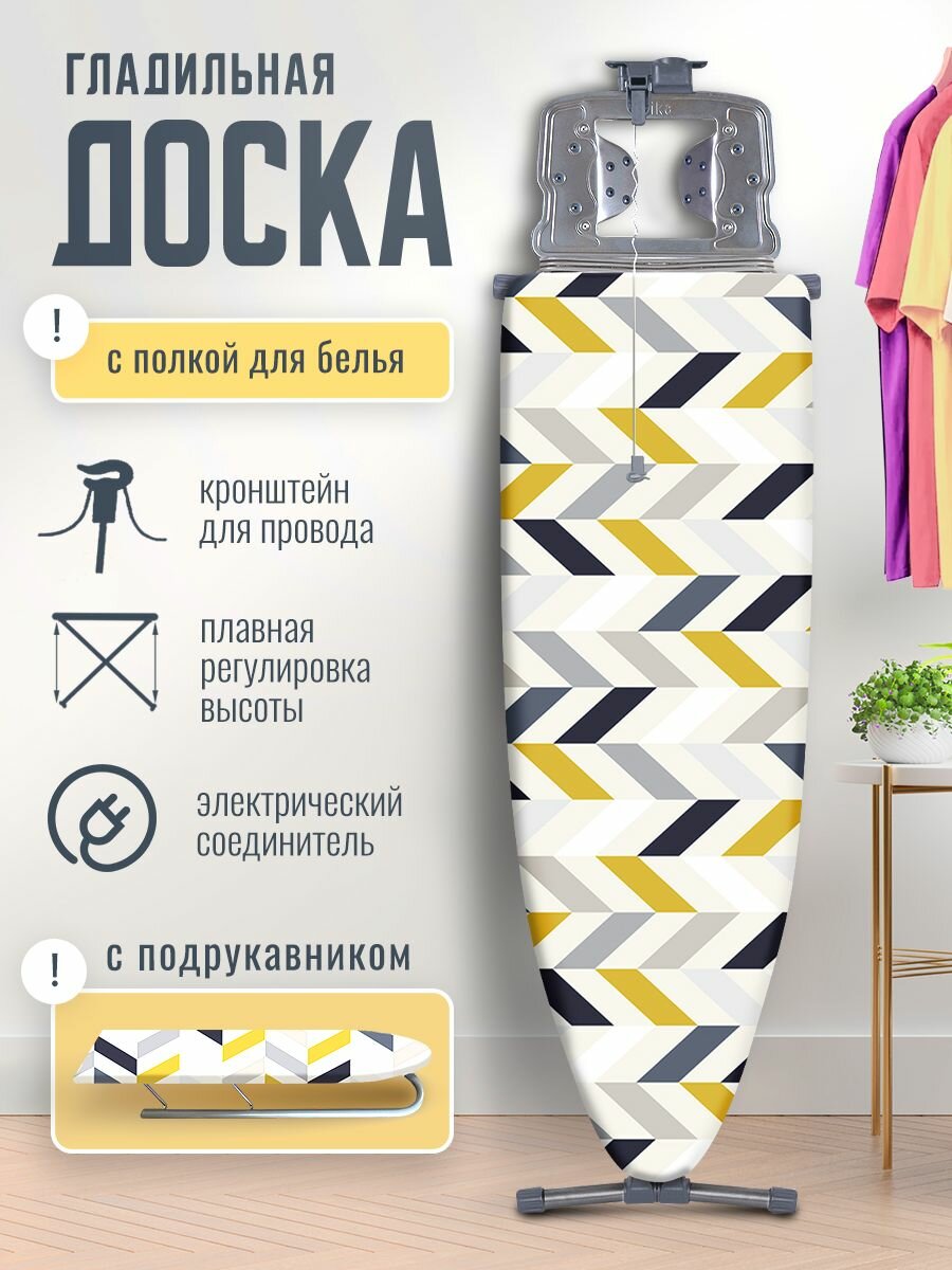 В комплекте с доской идут подрукавник для удобства глажки рукавов и полка для белья, что позволяет организовать рабочее пространство и хранить белье в порядке.
