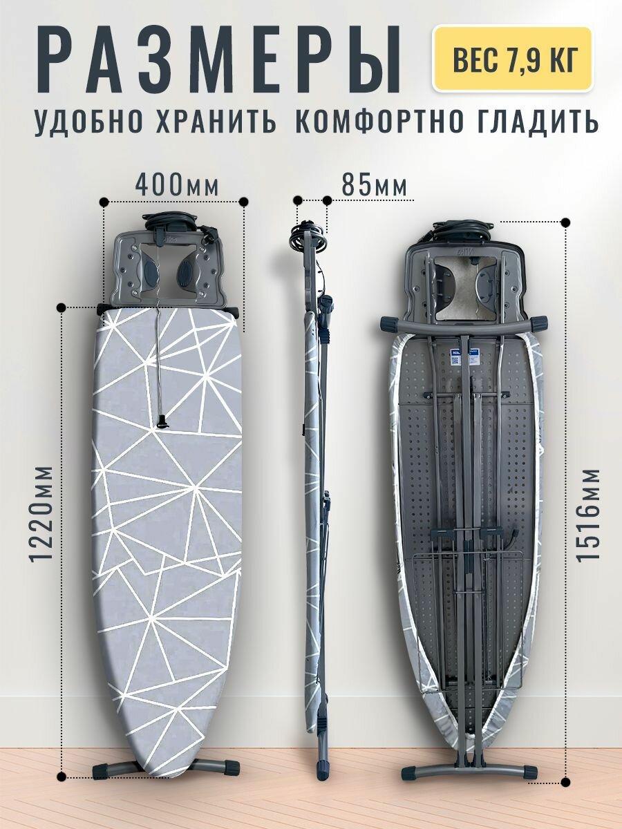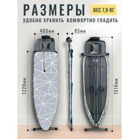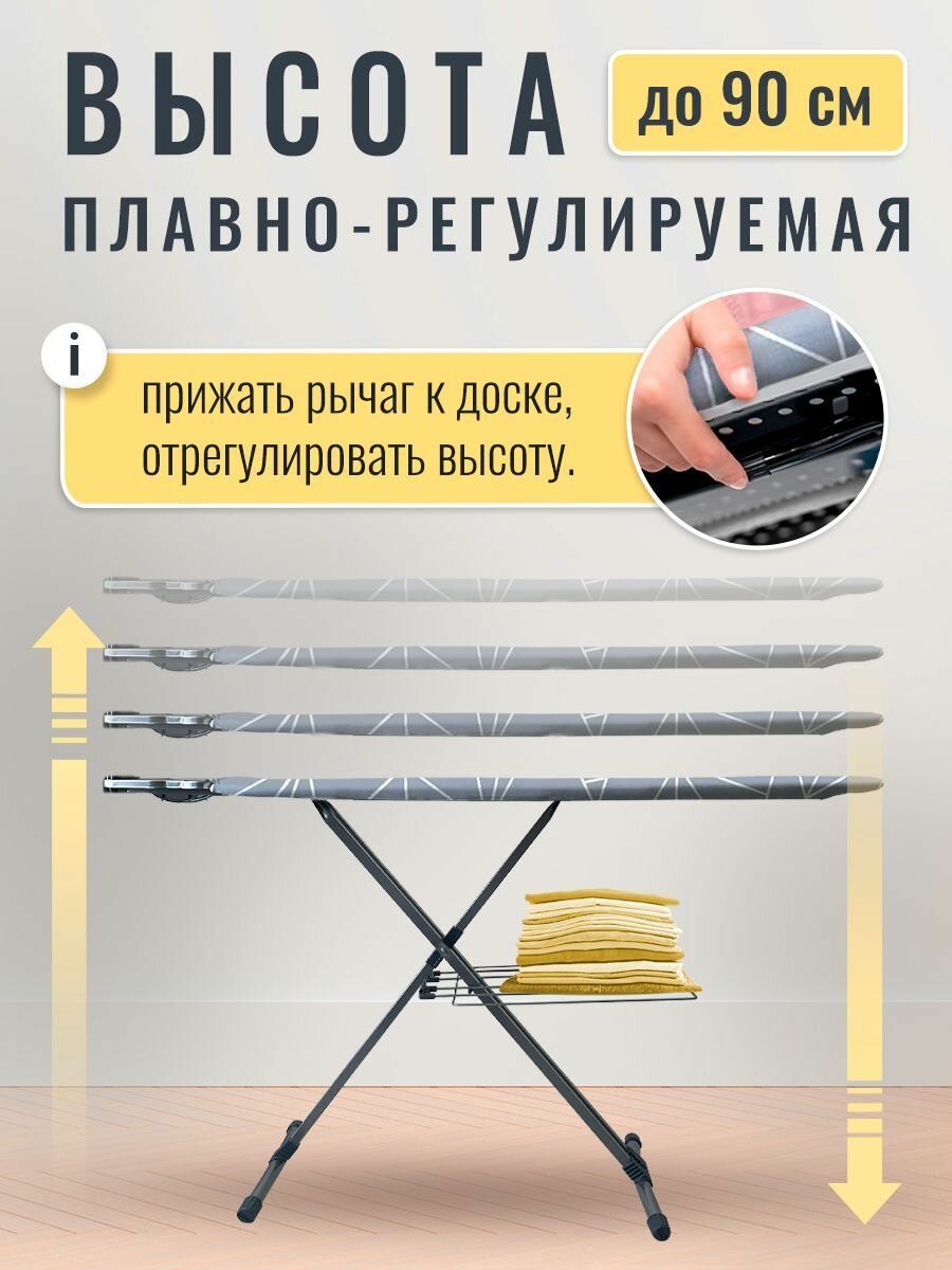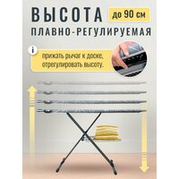 Доска оснащена плавной регулировкой по высоте, что позволяет выбрать оптимальное положение для удобства глажки. Максимальная нагрузка на гладильную поверхность составляет 25 кг, что говорит о высокой прочности и долговечности конструкции.