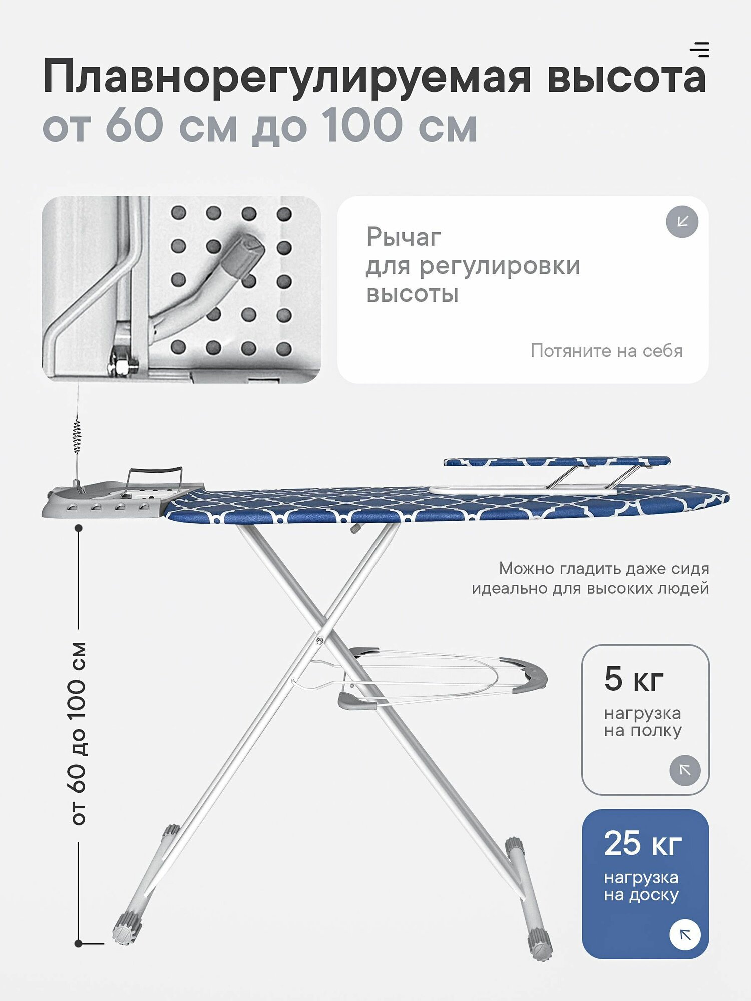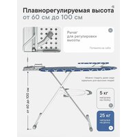 Настраивайте рабочую высоту под свой рост с помощью плавной регулировки до 1 метра, чтобы гладить без напряжения в спине. В сложенном виде (1600х460 мм) доска компактна и надежно фиксируется специальным замком для безопасного вертикального хранения.