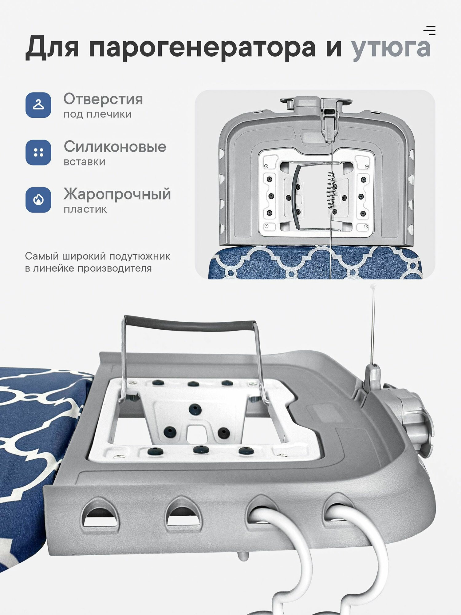 - Держатель шнура, который не позволяет проводу мешать и сминать ткань.