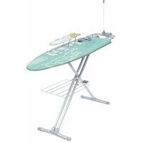 Особенности: Надёжная металлическая поверхность с отверстиями для пара Съёмный чехол из хлопка Плавно регулируемая высота Кронштейн для провода утюга Полка для белья Переносной подрукавник Электрический соединитель 1.9 м.