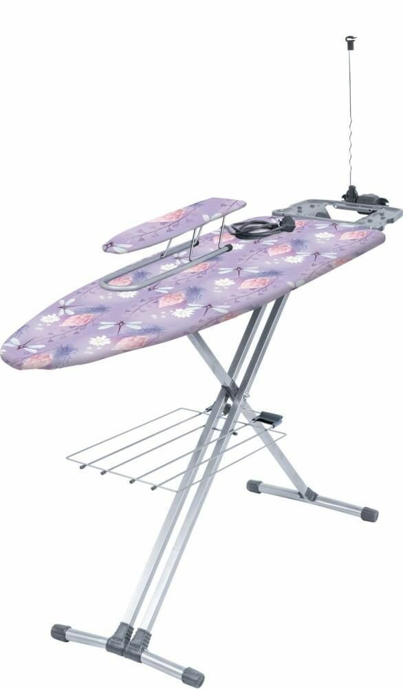 гладильная доска с подставкой под утюг, кронштейном для провода утюга и полкой для белья; переносной подрукавник