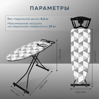 Гладильная поверхность-металл(1220х420мм), удобная подставка под утюг для правши и для левши, плавно регулируемая высота до 0,95м, электросоединитель 1,6м и обрезиненные колесики для легкого премещения, материал чехола-хлопок, max нагрузка на глад. поверхность 25кг, вес изделия-7,5кг. Размер упаковки 1590х465х135мм.