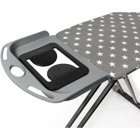Доска оснащена подставкой для утюга, что позволяет разместить утюг в удобном положении и обеспечивает безопасность при глажке.