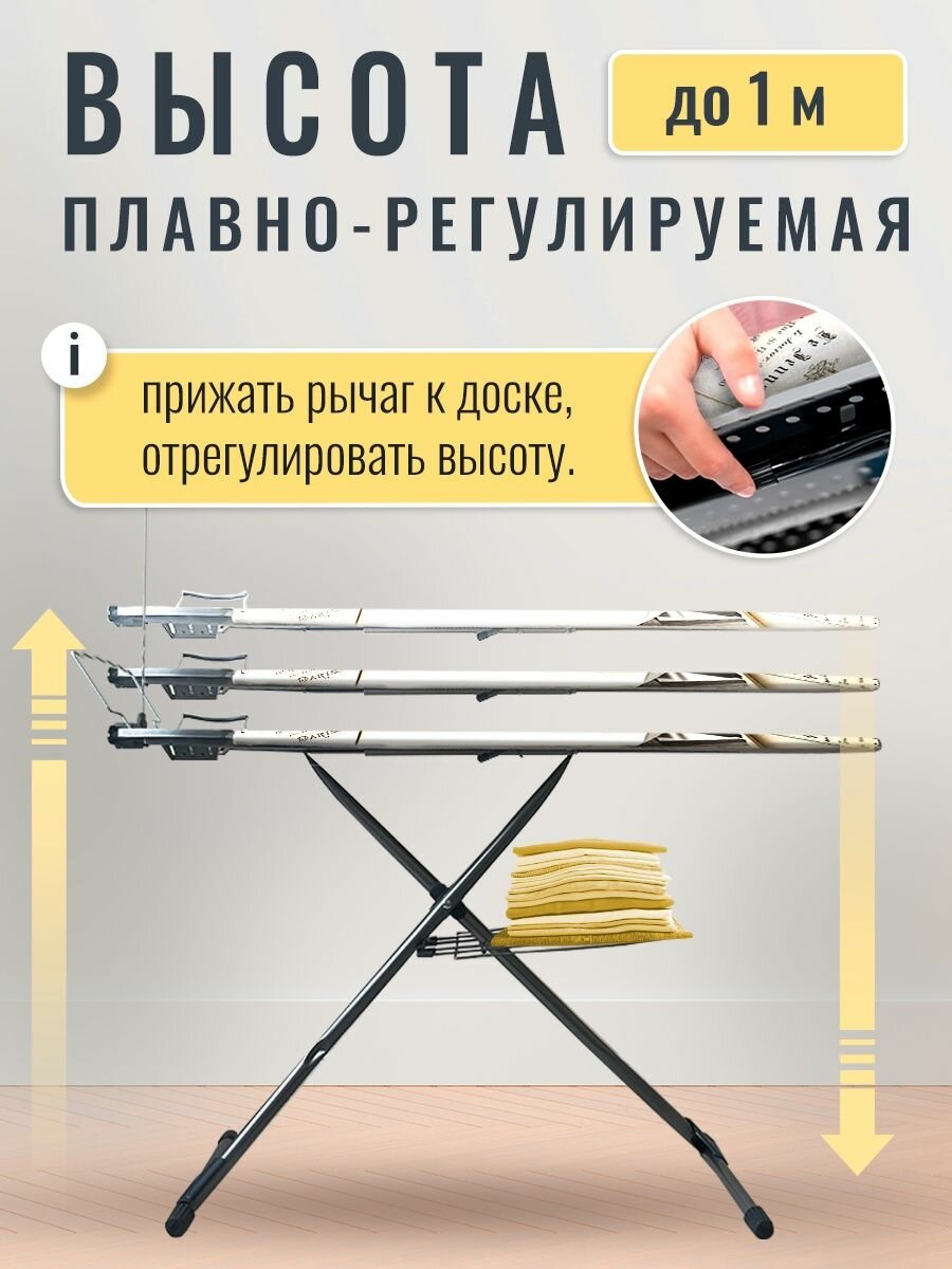 Гладильная доска Ника Гранд металлическая с плавной регулировкой по высоте до 1 метра, с подставкой под утюг или парогенератор. Широкая подставка под утюг и парогенератор. Съемный чехол изготовлен из поролона и хлопка. Электросоединитель 1,9 м. Кронштейн для провода утюга. Розетка с держателем для провода утюга. Полка для белья. Рукав для гладильной доски. Максимальная нагрузка на гладильную поверхность 25 кг. Габаритные размеры: гладильная поверхность - 122 х 42 см; В сложенном виде 151 х 42 см ; Вес - 7,5 кг. Доска гладильная металлическая