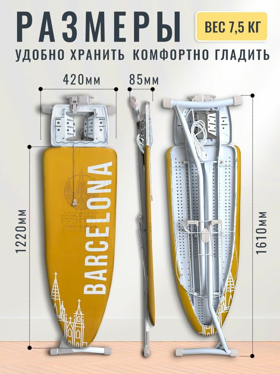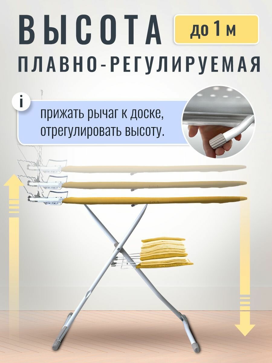 Гладильная доска Ника Гранд металлическая с плавной регулировкой по высоте до 1 метра, с подставкой под утюг или парогенератор. Широкая подставка под утюг и парогенератор. Съемный чехол изготовлен из поролона и хлопка. Электросоединитель 1,9 м. Кронштейн для провода утюга. Розетка с держателем для провода утюга. Полка для белья. Рукав для гладильной доски. Максимальная нагрузка на гладильную поверхность 25 кг. Габаритные размеры: гладильная поверхность - 122 х 42 см; В сложенном виде 151 х 42 см ; Вес - 7,5 кг. Доска гладильная металлическая