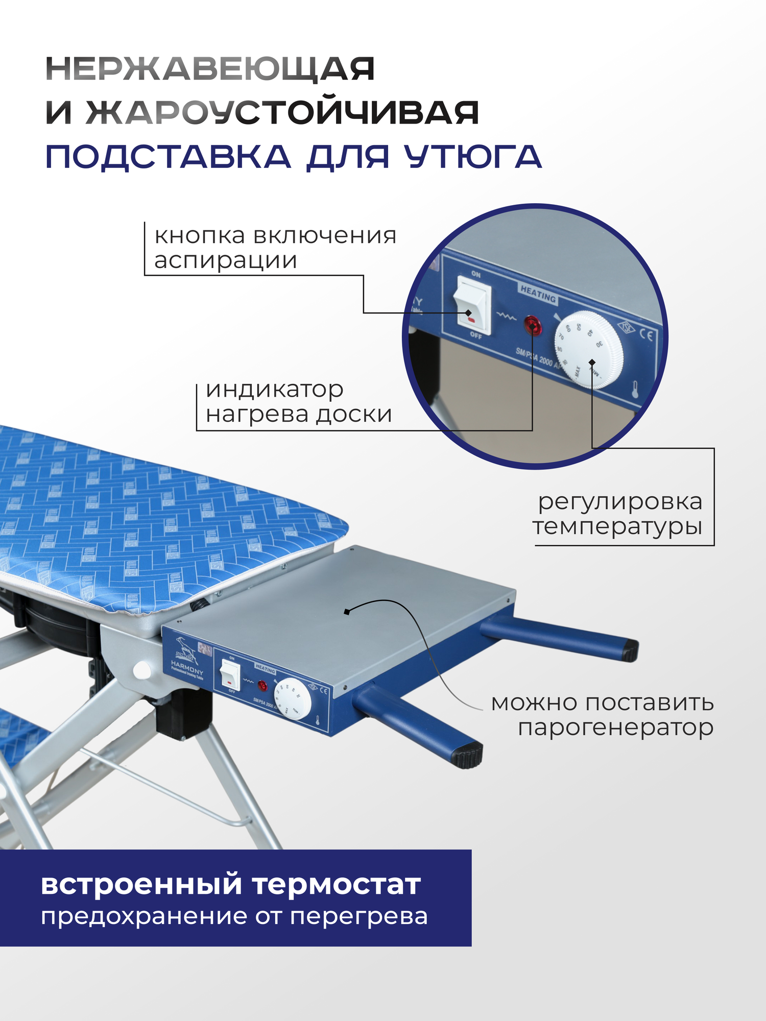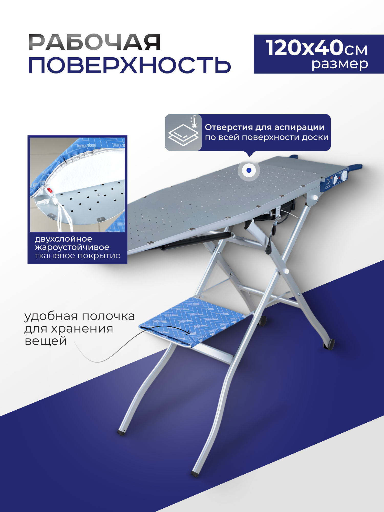 | Дополнительная информация | Форма рабочей поверхности - консольная Размер рабочей поверхности - 120x40 см Мощность нагрева доски – 600 Вт Мощность вентилятора – 70 Вт Емкость вентилятора – 200 м3/час Объем бойлера парогенератора - 1 л Давление – 2,5 bar Мощность тэна бойлера – 1000 Вт Мощность тэна утюга – 800 Вт Вес утюга – 2 кг Выход пара – 70 г/мин Манометр – Да Регулятор пара – Нет Вертикальное отпаривание - Да Слив воды - Да Напряжение - 220 В Вес – 34 кг Встроенный парогенератор – Да Нагрев рабочей поверхности – Да Вакуумная аспирация – Да Наддув - Нет |