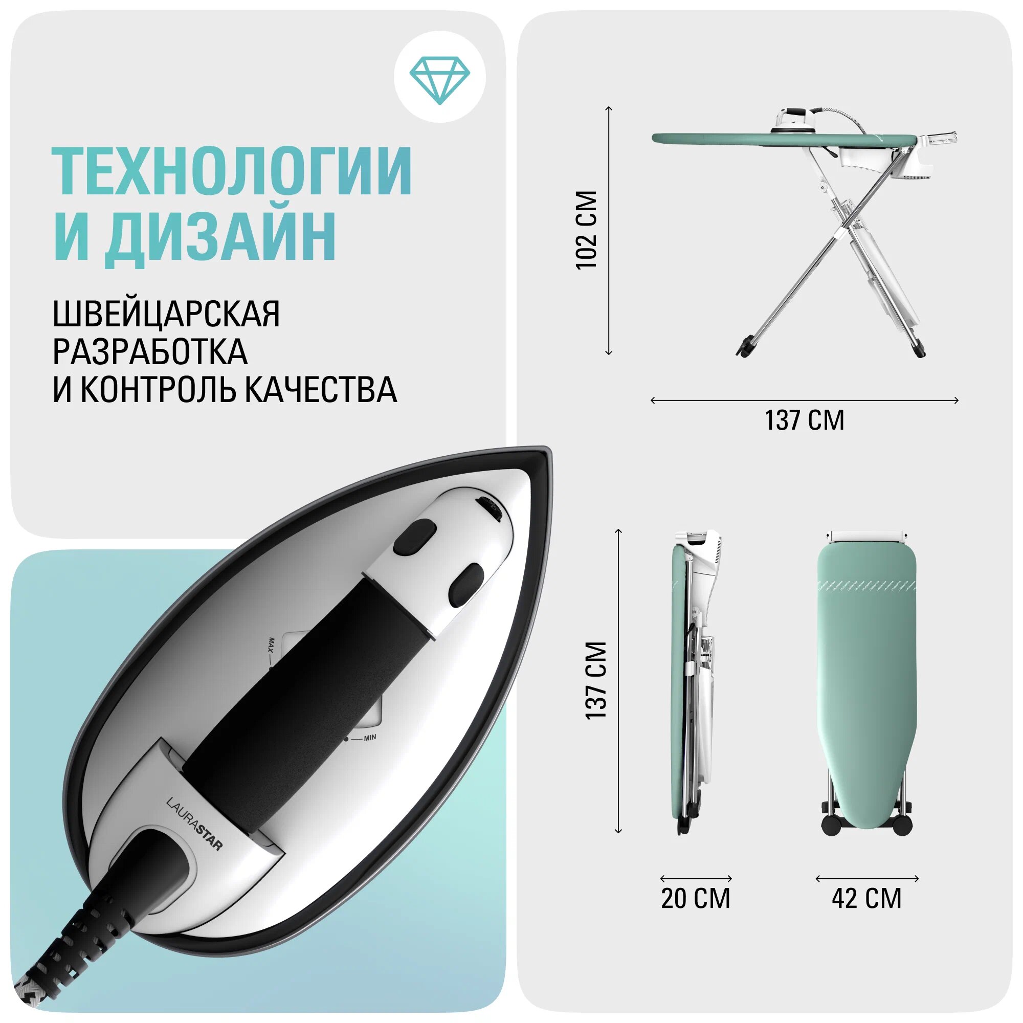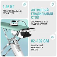 | Особенности конструкции | индикация уровня воды, складная конструкция, съемный резервуар для воды, фильтр для воды, держатель парового шланга, индикация готовности к работе, колесики, регулировка высоты доски |
