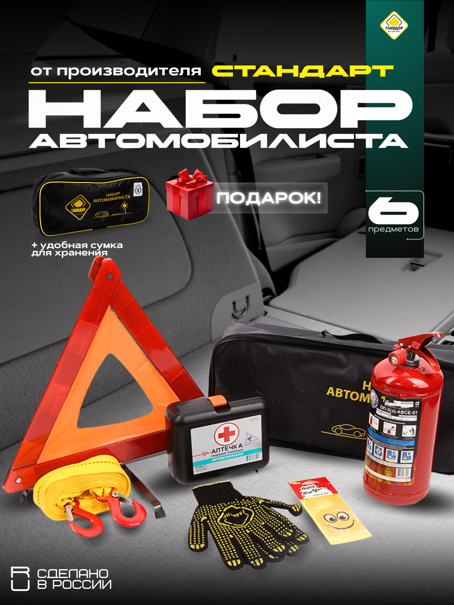 Состав набора: - Аптечка автомобильная первой помощи (комплект перевязочных средств) - Знак аварийной остановки с оракалом в защитном пластмассовом боксе - Огнетушитель порошковый 2 кг, ОП-2(3) АВСЕ - Перчатки из хлопка с точечным ПВХ покрытием, 23 см - Сумка на молнии для хранения всех предметов (в защитной упаковке) - Трос буксировочный с 2 крюками, 5 т х 5 м - Защитная маска - Подарок (подарок ароматизатор может отличаться от представленного на фото)