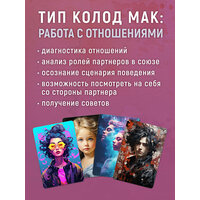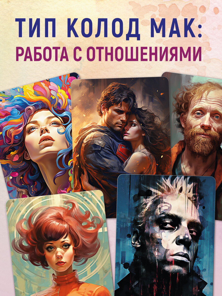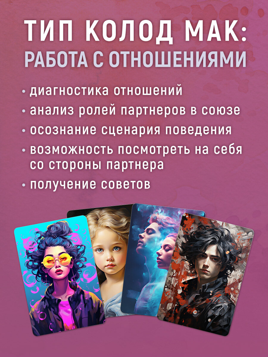 Карты из этого набора помогут исследовать взаимоотношения как межполовые, детско-родительские, так и семейные. Набор включает в себя карты с женскими, мужскими и детскими архетипами, а также карты с изображениями различных типов взаимоотношений между мужчиной и женщиной.