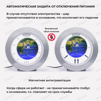 Для создания уютной атмосферы шар подсвечивается светодиодами по всей окружности рамки. Парящий глобус с подсветкой буквально завораживает, от него трудно отвести взгляд. Можно использовать, как ночной светильник, а разноцветное свечение невероятно загадочно смотрится в темноте.