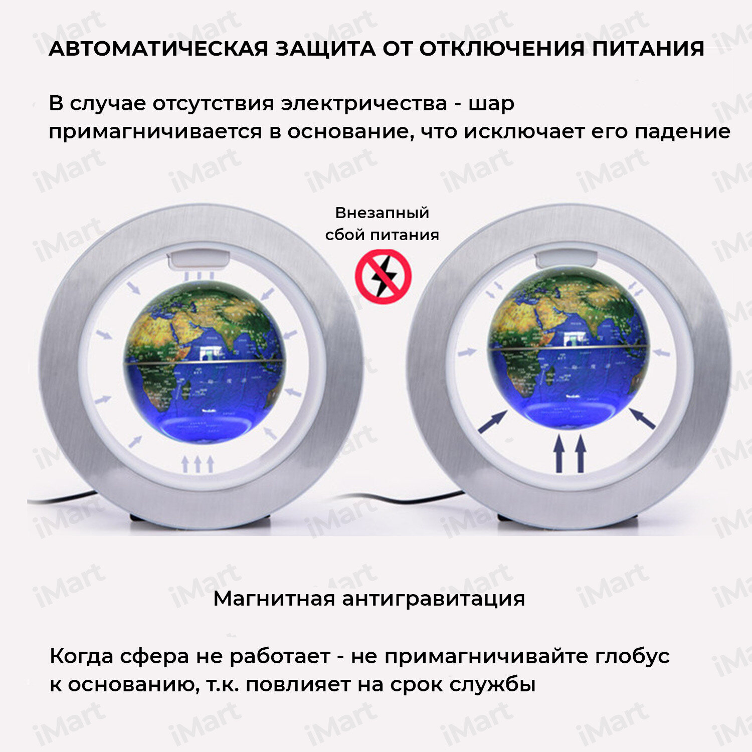 Левитационный глобус диаметром 10,6см - глобус-левитрон, принцип работы которого аналогичен принципу работы электромагнитов, т. е. в глобус и подставку встроены магниты и катушка, создающие магнитное поле, благодаря которому глобус левитирует в воздухе. Сам глобус располагается в круглой рамке со светодиодной подсветкой. В рабочем состоянии глобус, также, вращается и имеет белую подсветку.