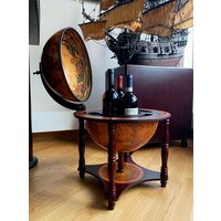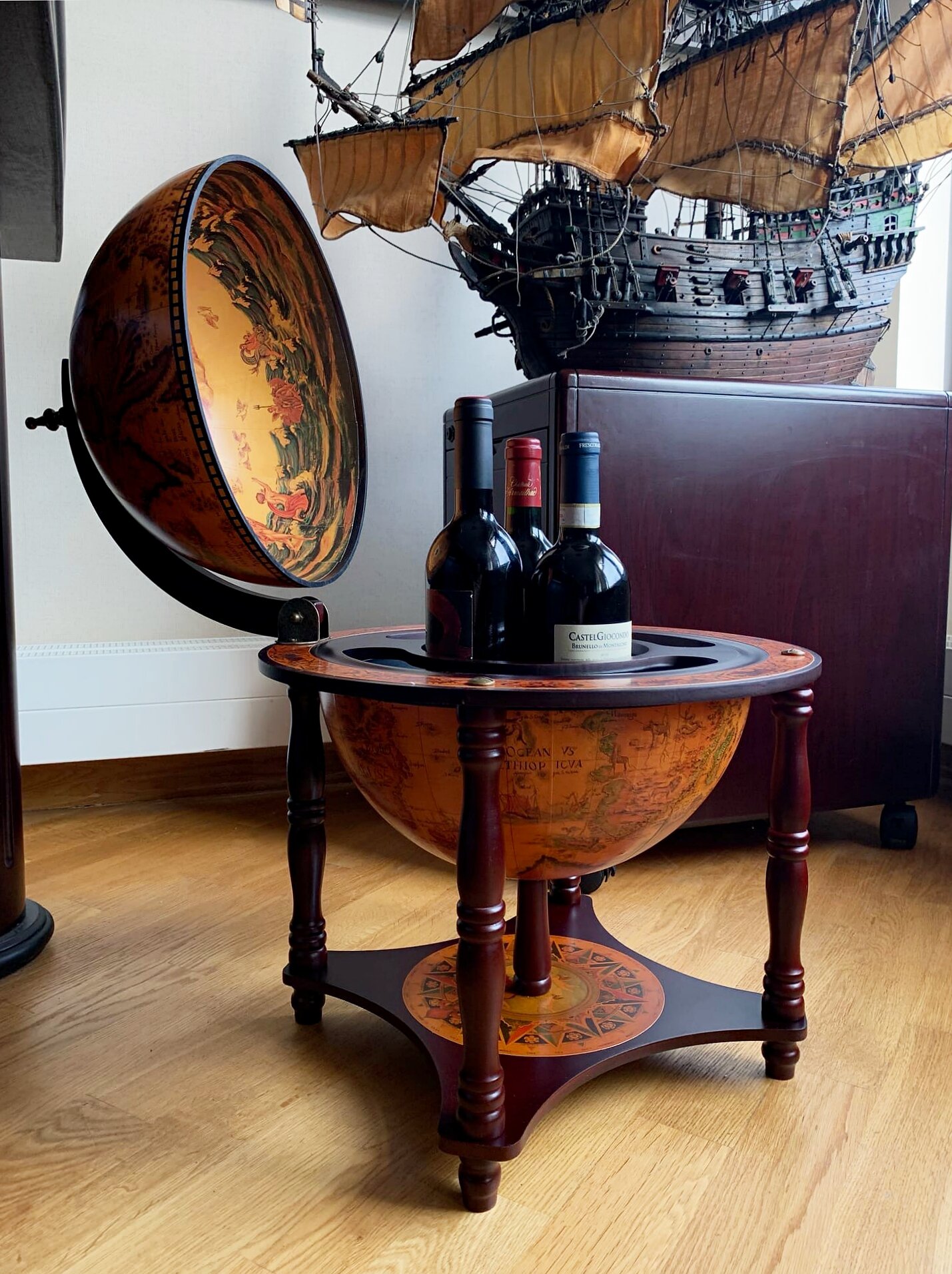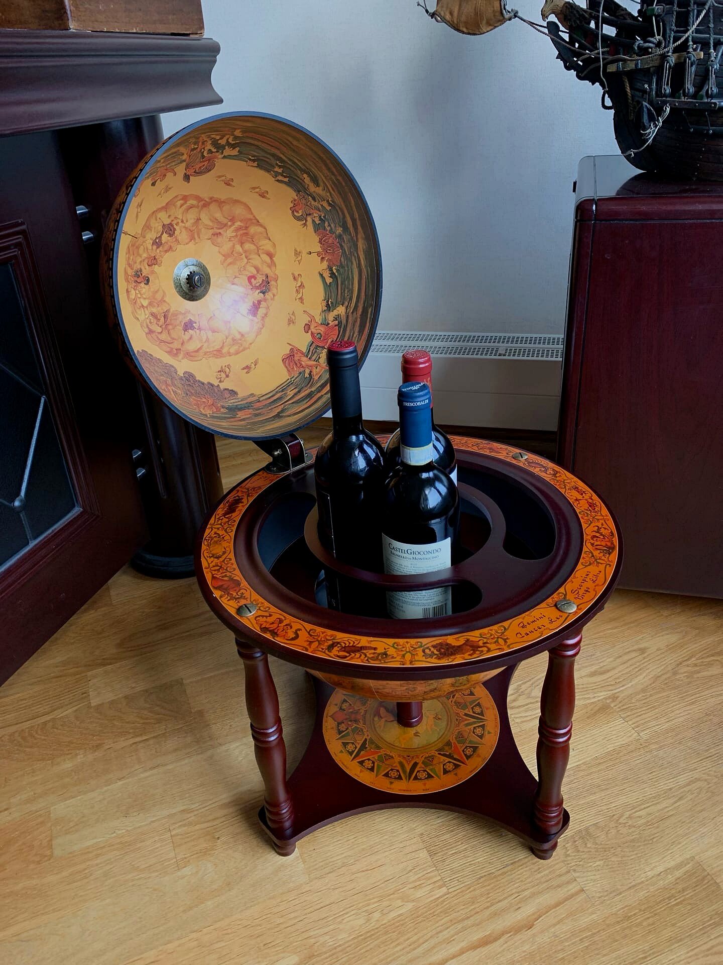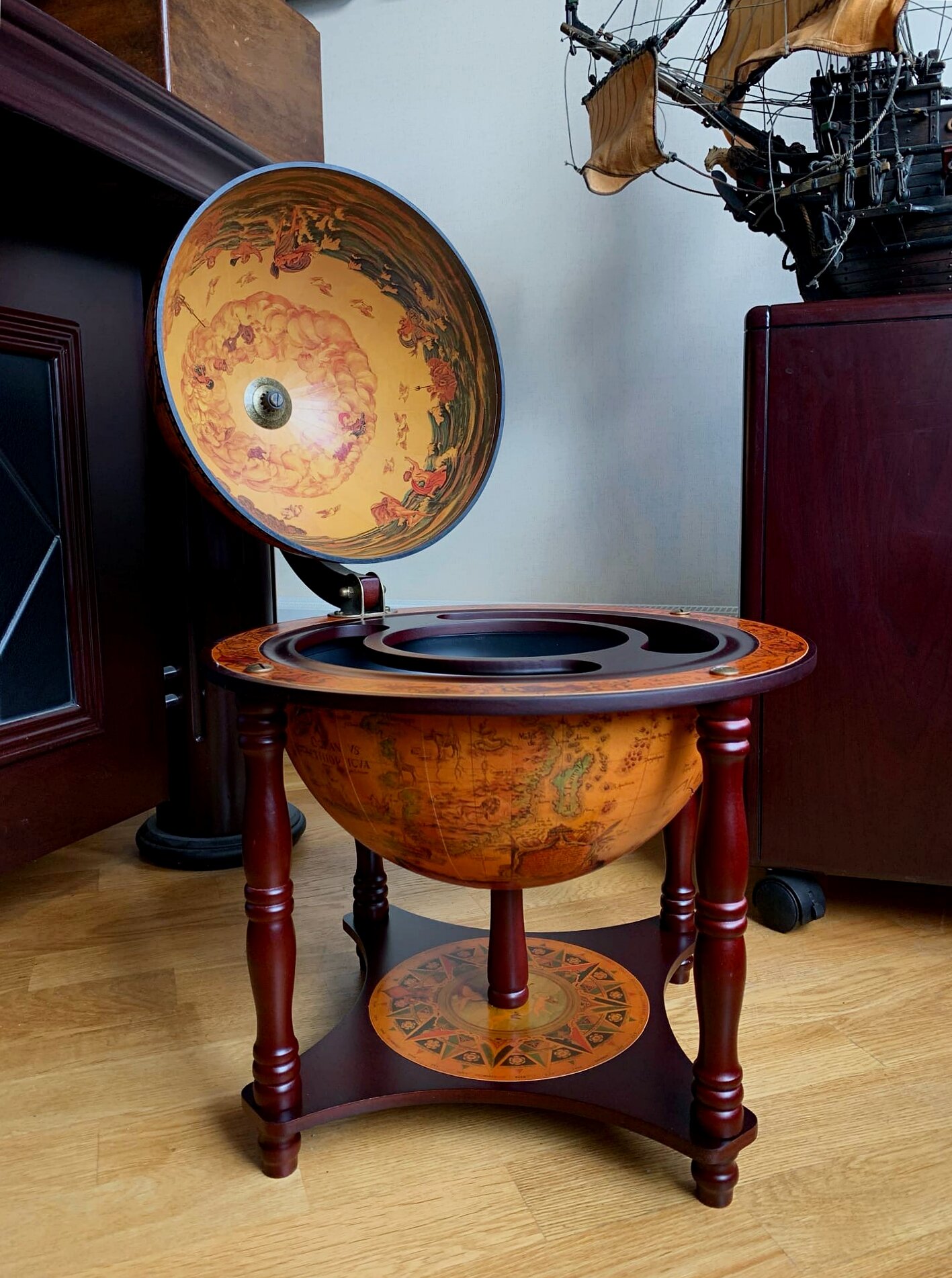 Напольный глобус-бар со старинной картой мира станет достойным подарком. Декоративный бар, выполненный из дерева - это не только необычный и притягивающий взгляд элемент интерьера, подчеркивающий статус своего владельца, но и удобный и практичный мини-бар. Внутри сферы глобуса помещается несколько бутылок с напитками и бокалы. Приятные коричневые тона окраски глобуса придают этому предмету интерьера теплоту и несомненный шарм. Кроме того, глобус бар - это очень универсальный подарок для каждого, что мечтал иметь у себя настоящий домашний бар. Подойдет глобус-бар для дома , дачи и офиса. Напольный глобус бар продается в разобранном виде. Сборка занимает от 5 до 15 минут (обычно необходимо прикрутить ножки и соединить два полушария, из инструментов достаточно одной отвертки). Бар для алкогольных напитков, Бар домашний,Подарки для мужчин, Мини бар, Настольный бар, Бар для интерьера, Бар для хранения напитков, Винный бар, Эксклюзивный подарок