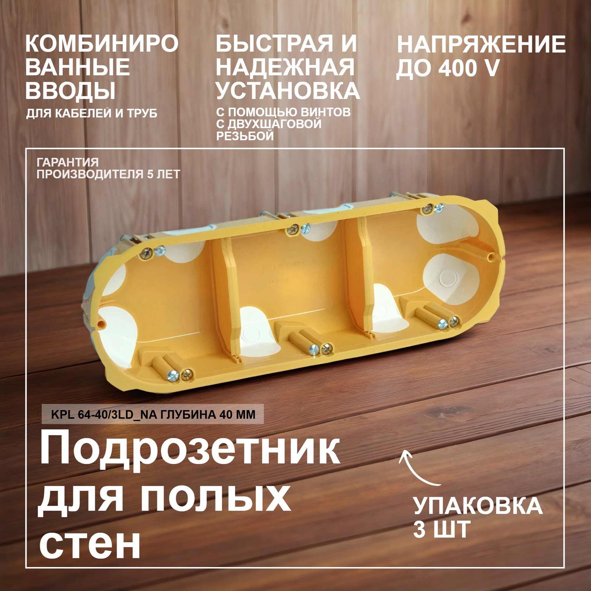 Глубина 40мм. уп/3шт Коробка огнестойкая установочная для полых стен герметичная KPL 64-40/3LD_NA 68x209x40 3 поста: сравнение цен, характеристики, фото, актуальное наличие и цены.
