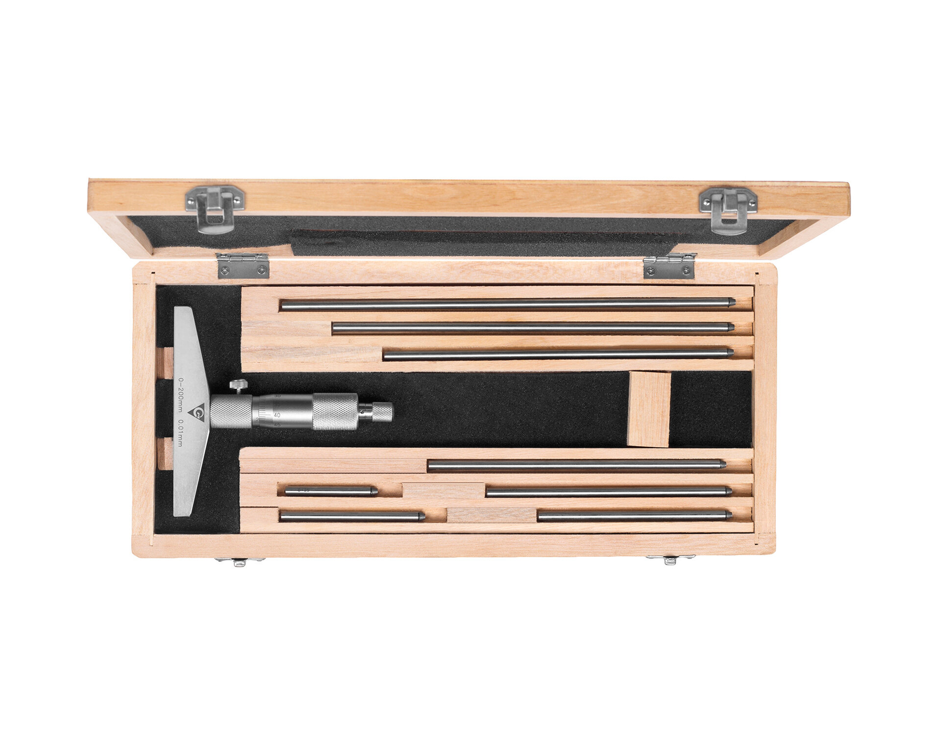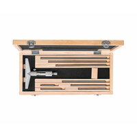 Глубиномер микрометр. ГМ-200 0.01 - предназначен для измерения глубины пазов и высоты уступов. Состоит из микрометрической головки, стебля, основания и наконечника, покрытого твердым сплавом. Микрометрическая головка аналогична барабану микрометра. Считывают размеры при пользовании этим инструментом так же, как и при замерах микрометром. Цифры у штрихов стебля и барабана нанесены в обратном порядке по сравнению с микрометрами, так как чем больше глубина, тем дальше выдвинут микровинт. Материал изготовления – углеродистая или нержавеющая сталь. Хранить прибор следует в специальном пластиковом или деревянном кейсе, который поставляется в наборе. Глубиномеры должны эксплуатироваться при температуре 20±15°С и относительной влажности воздуха не более 80% при температуре 25°С. Имеет верхний предел измерения 200 мм, с ценой деления 0.01 мм. Производство бренда Micron.