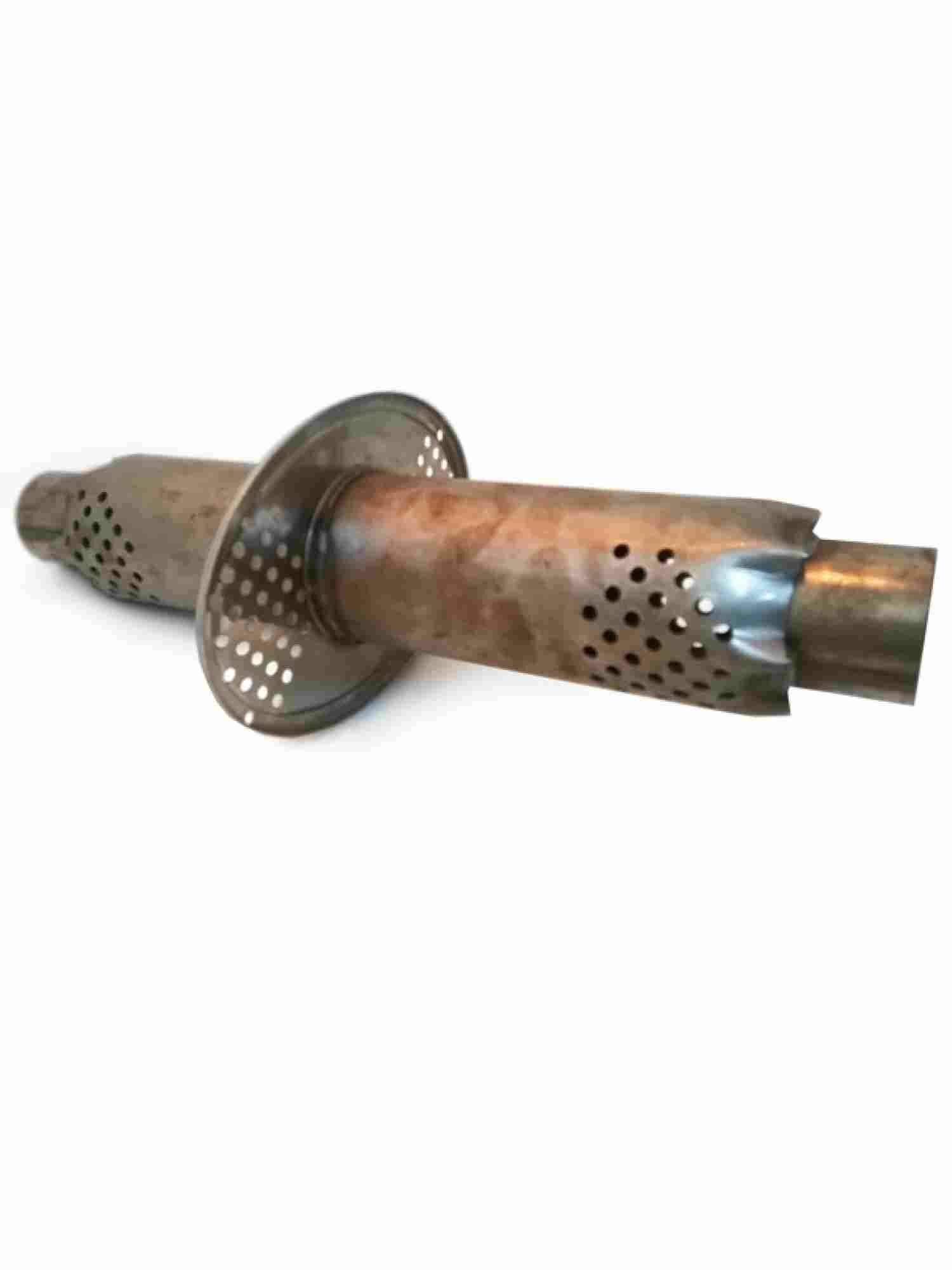 Поступающая вовнутрь звуковая волна отражается от перегородки (конуса) и выходит через отверстия (перфорацию), рассеиваясь в объеме глушителя. Каждое отверстие вместе с полостью глушителя является резонатором, возбуждающим колебания собственной частоты. Условия распространения резонансной частоты резко меняются, и она эффективно гасится вследствие трения частиц газа в отверстии.